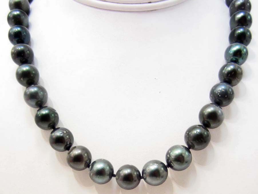 35 mixed smoky gray Tahitian South Sea Cultured Pearls 12.26 - 11.10 mm. Sterling Silver clasp. Appraised Value $11,702.00