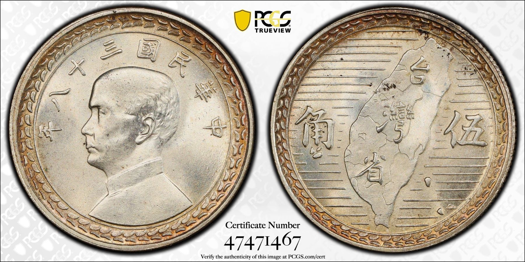 TAIWAN: AR 5 chiao, year 38 (1949), Y-532, L&M-330, one-year type, an excellent mint state example, PCGS graded MS65.