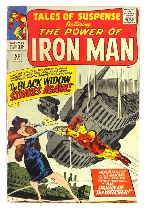 THIS IS A NICE, TIGHT BOOK WITH ONLY LIGHT / MEDIUM WEAR. NO ACTUAL CREASES, BUT A COUPLE OF VERY MINOR CRINKLES. THIS IS THE SECOND BLACK WIDOW APPEARANCE AND THE LAST STORY DETAILS THE ORIGIN OF THE WATCHER. "FINE-" EST. $85.00 - $95.00
