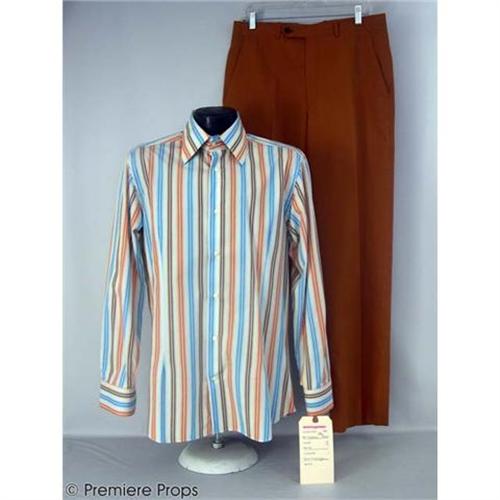TALK TO ME - A great item from the film, this is Petey's (Don Cheadle) screenworn costume. It includes an "Alexander McQueen" slim-fit button-down dress shirt with blue, orange, brown, and cream stripe pattern, and a pair of orange "Aquarius" trousers with extended button tab closure and side slash pockets. Outfit includes wardrobe tag. Add this remarkable costume to your movie memorabilia collection today! (TTM1084)