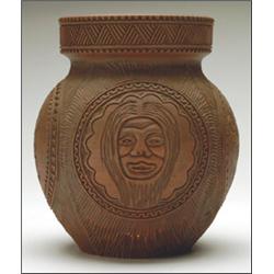 A Six-Nations ceramic vase with all over carved decoration and a brown glaze, signed and titled, 8" - 20.3 cm.