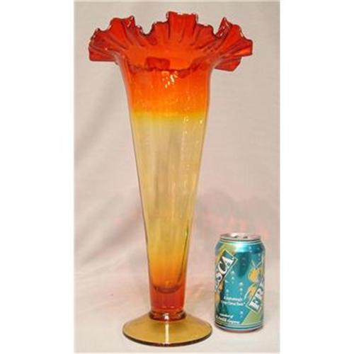 a fine and rare example 19th.century wheeling amberina.the color runs from a fine ruffled mahogany edge to dark red to amber back to rich red with the applied amber foot.it has optic interior and the foot is applied.the foot showes the correct wear for a vase of thie age. this is the rarest and finest of wheeling blown amberina!!!! THIS 15" AMBERINA VASE WILL BE AN ASSET TO ANY FINE HOME OR COLLECTION!!!!!!!!!!!!!