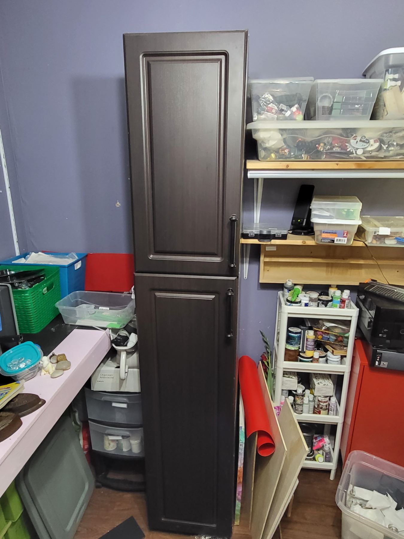 TALL BROWN CABINET WITH 6 SHELVES. MEASURS 15.5" X 24.5" X 80. COMES EMPTY NO LIGHTING