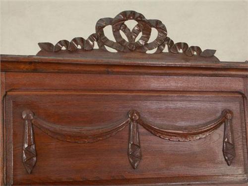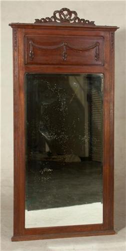 MIRROR: Tall Circa 1890 French Provincial oak mirror, beveled mirror, carved swags and carved/pierced crest ribbons. 75''h x 34''w