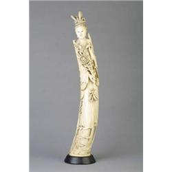 Extremely tall and very well-carved, old Chinese ivory figure of a standing beauty holding a flowering branch (small chips and minor craze mark); H: 36", wood stand