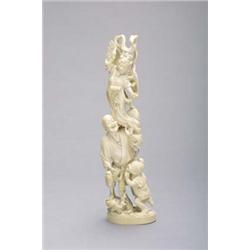 Very well-carved, finely detailed and tall, old Japanese ivory okimono of a fisherman and child standing amid waves as a female deity floats above (small chips), signed; H: 13 1/2"