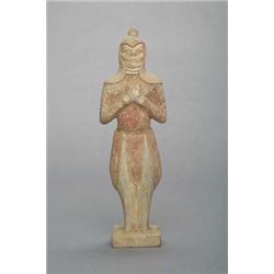 Tall and well-detailed, Chinese Northern Ch'i Dynasty, painted pottery figure of a standing guard or guardian wearing a long tunic gathered at the waist and with hands held to his chest (some usual repair), much original pigments remaining; H: 21 1/4"