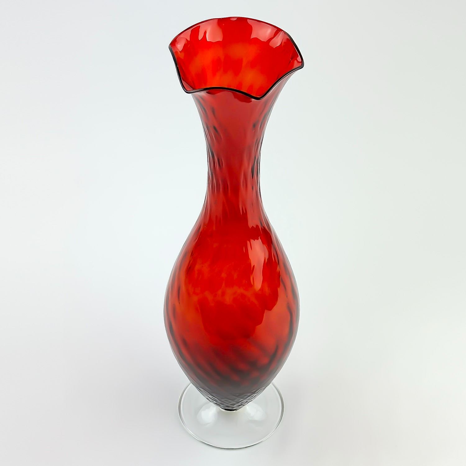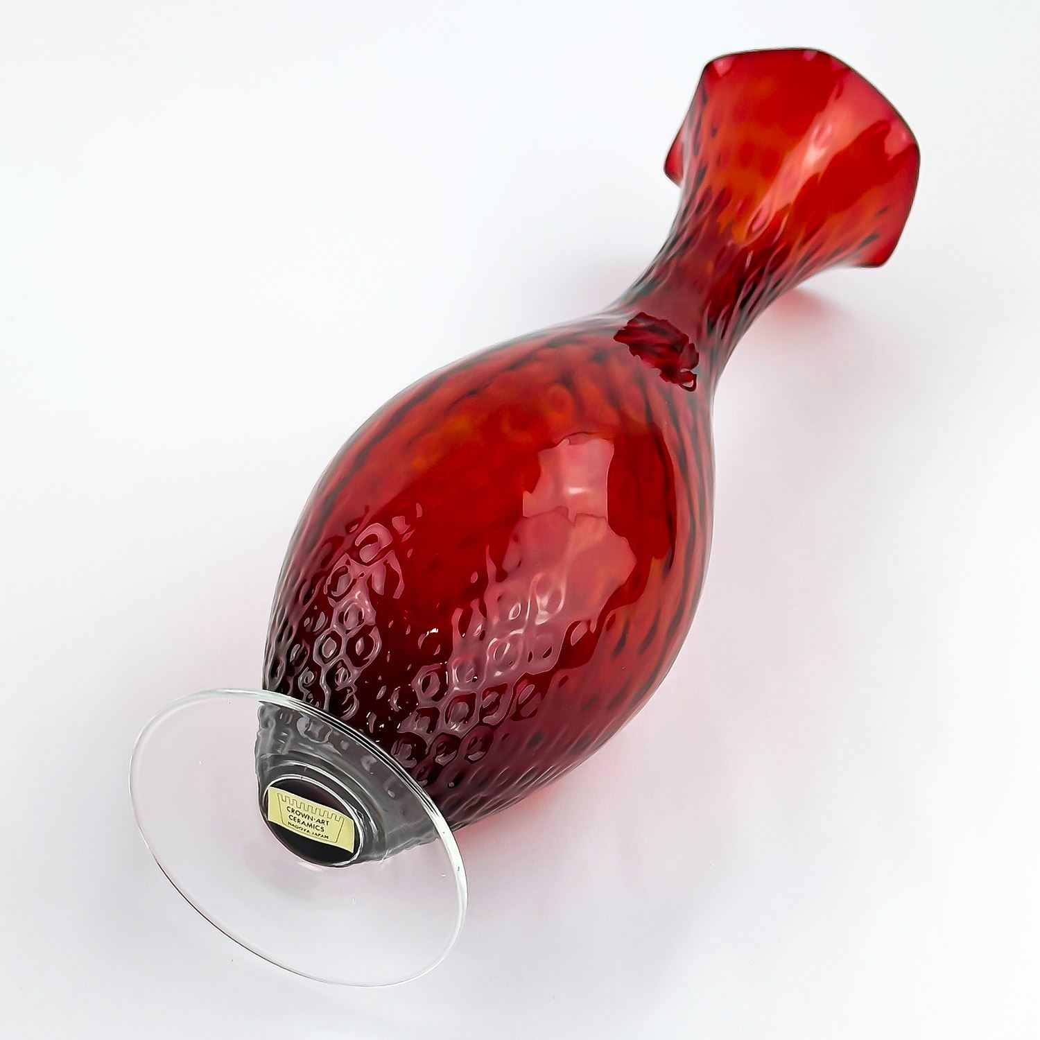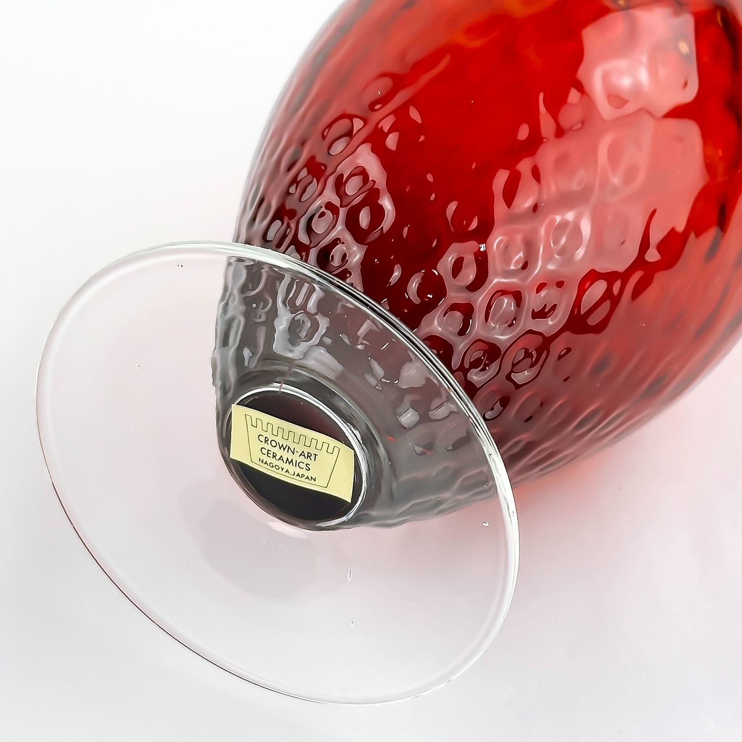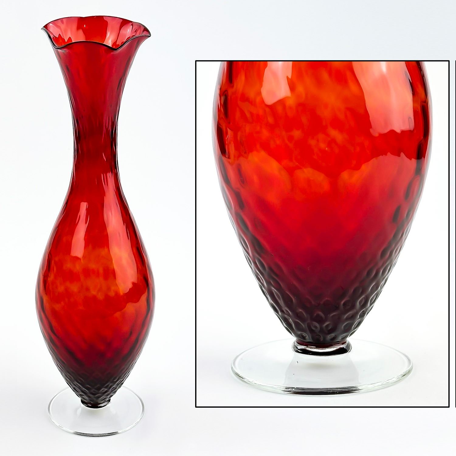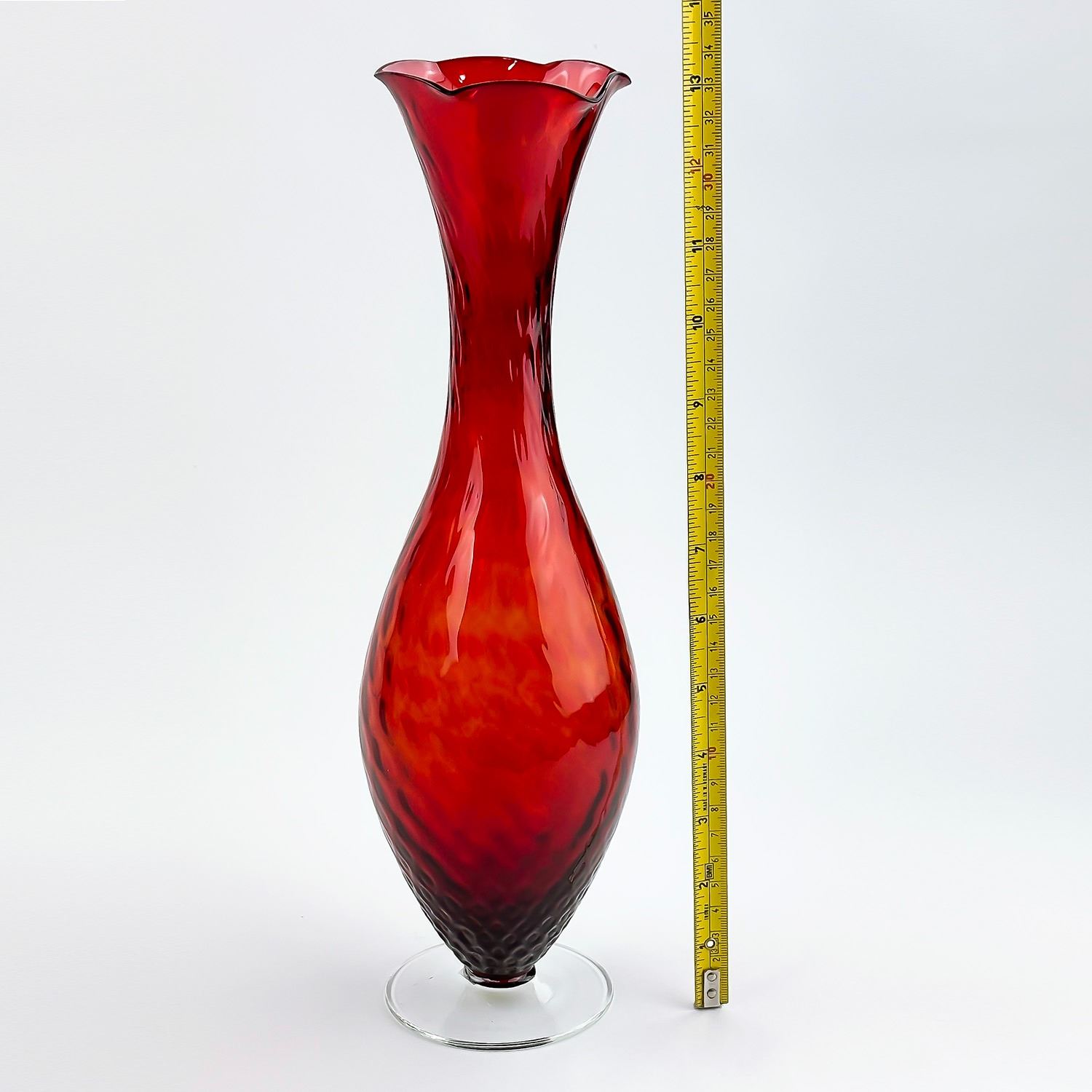 #8701 - VINTAGE TALL RUBY RED TEXTURED VASE. TAG ON BOTTOM READS CROWN-ART CERAMICS - NAGOYA, JAPAN. MEASURES: 13.25” (33.5 CM) TALL BY 4” (10 CM) WIDEST DIAMETER