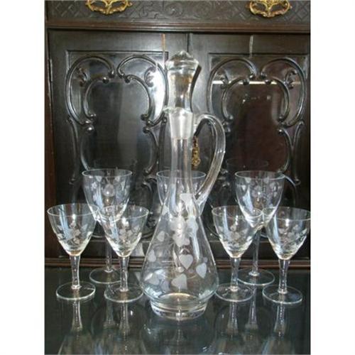 WE PRESENT TO YOU A TALL WINE DECANTER AND A SET OF STEMWARE, SHOWING A WHEEL CUT AND ETCHED PATTERN OF VIOLETS & PANSY. THE WHOLE SET IS IN EXTREMELY NICE CONDITION, NEAR PERFECT, THE DECANTER HAS A COUPLE OF VERY TINY SURFACE SCRATCHES,ALMOST UNNOTICEABLE, REALLY SMALL. THE STOPPER, BEING TALL LIKE THE DECANTER, HAS A HEXAGON SPOT ON THE VERY TOP AND 6 THUMB PRINT STYLE CUTS ENCIRCLING THE HEXAGON. THE SMALL WINE GLASS IS 6" TALL AND 3.5" IN DIAMETER, THE LARGER WINE GLASS IS 8" TALL AND 3.5" DIAMETER.