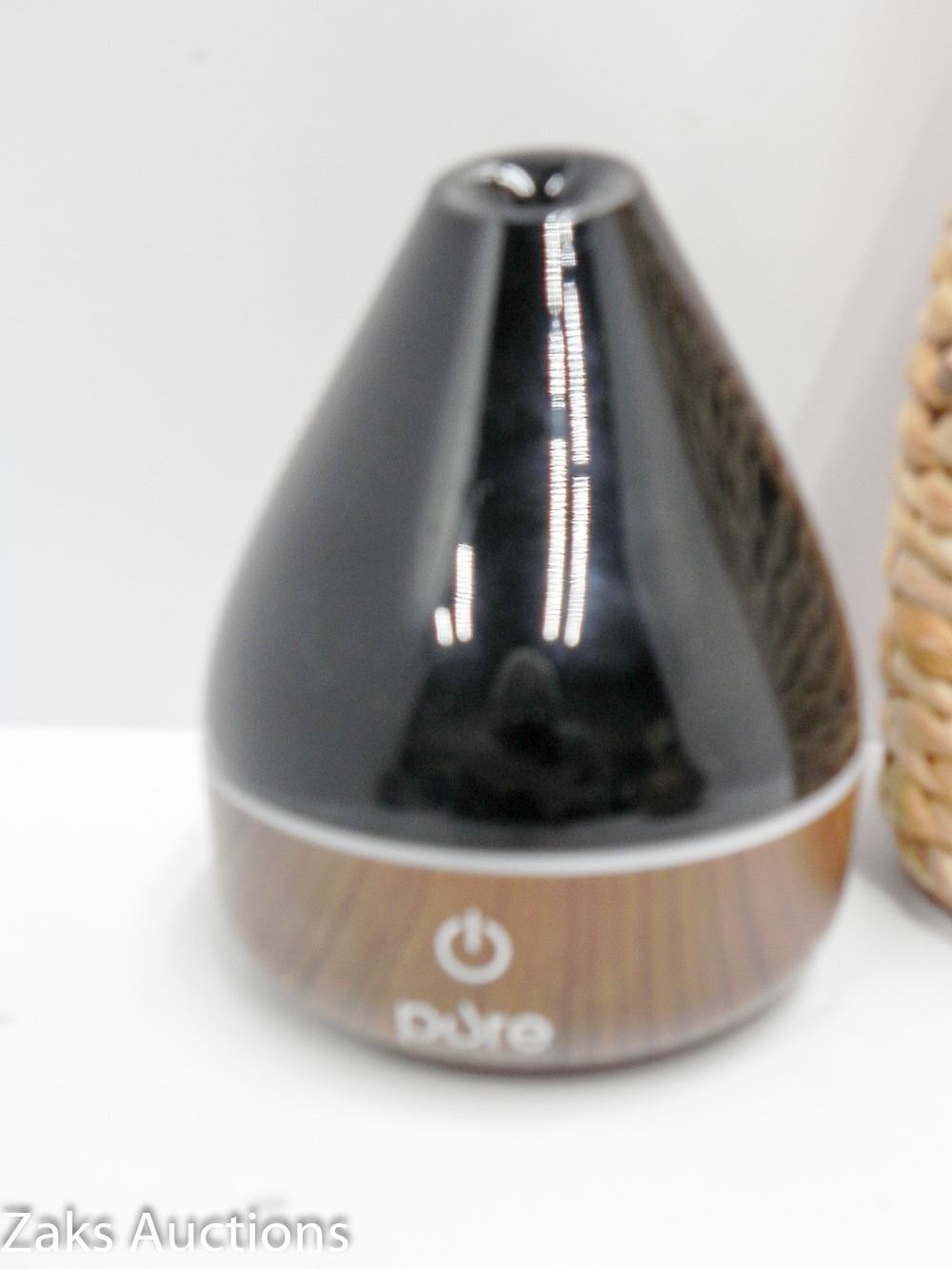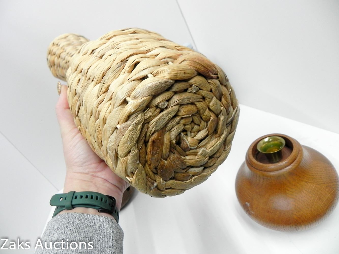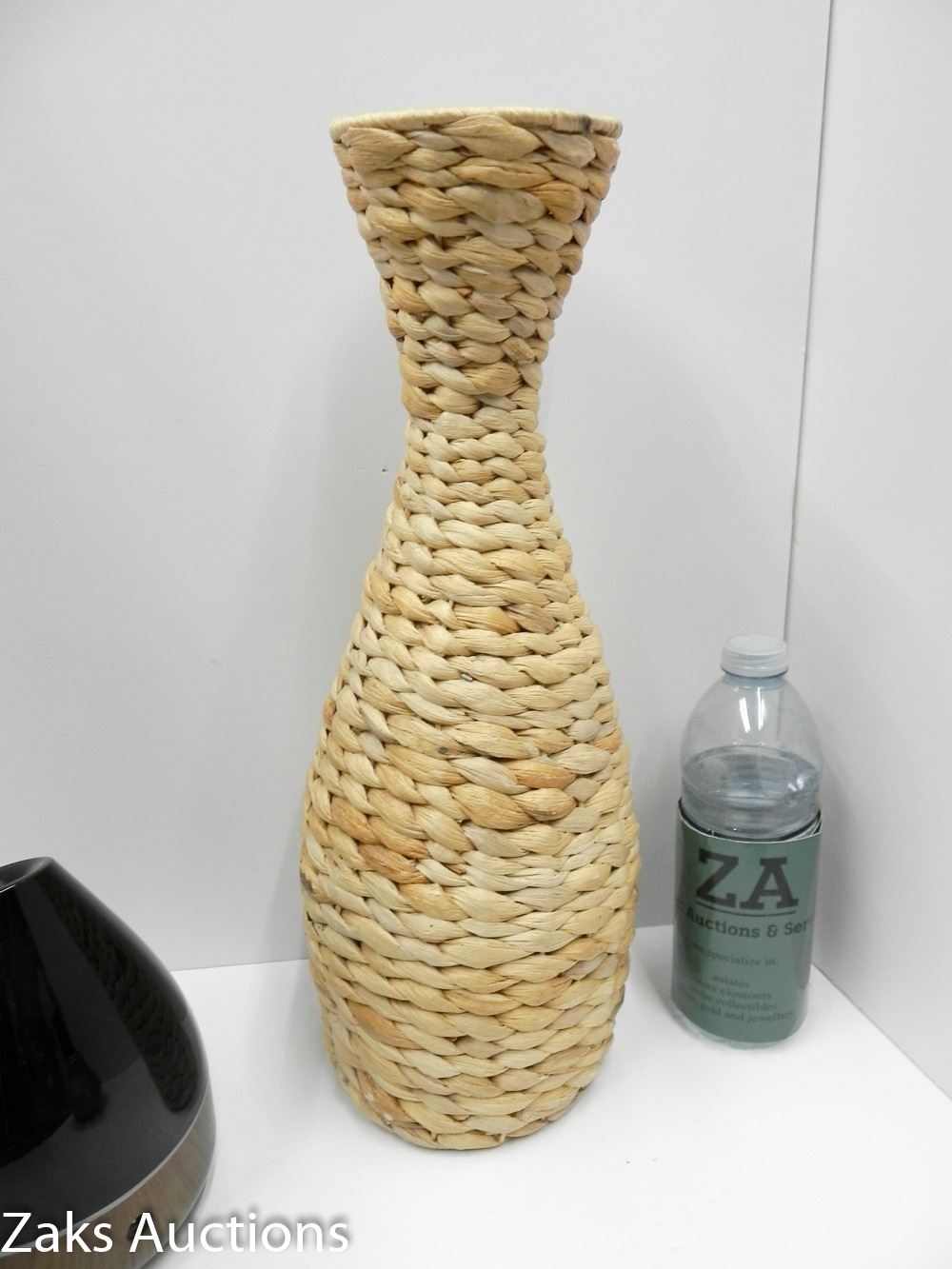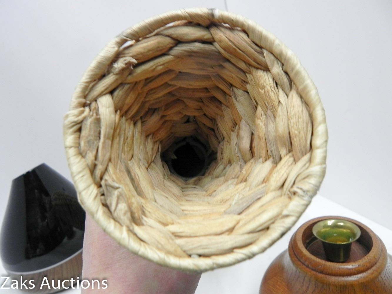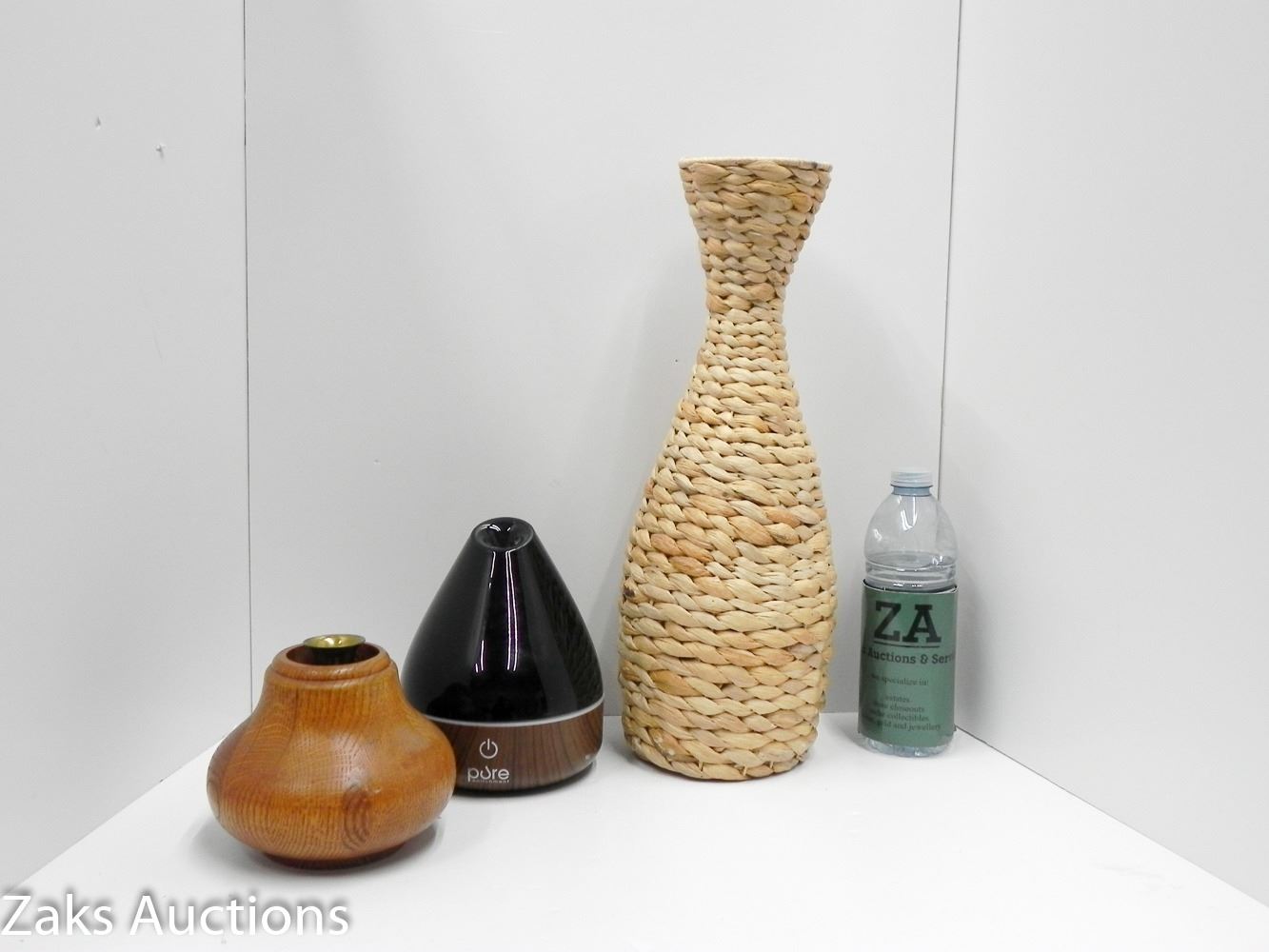 TALL WOVEN VASE, PURE OIL DIFFUSER AND WOODEN CANDLESTICK.