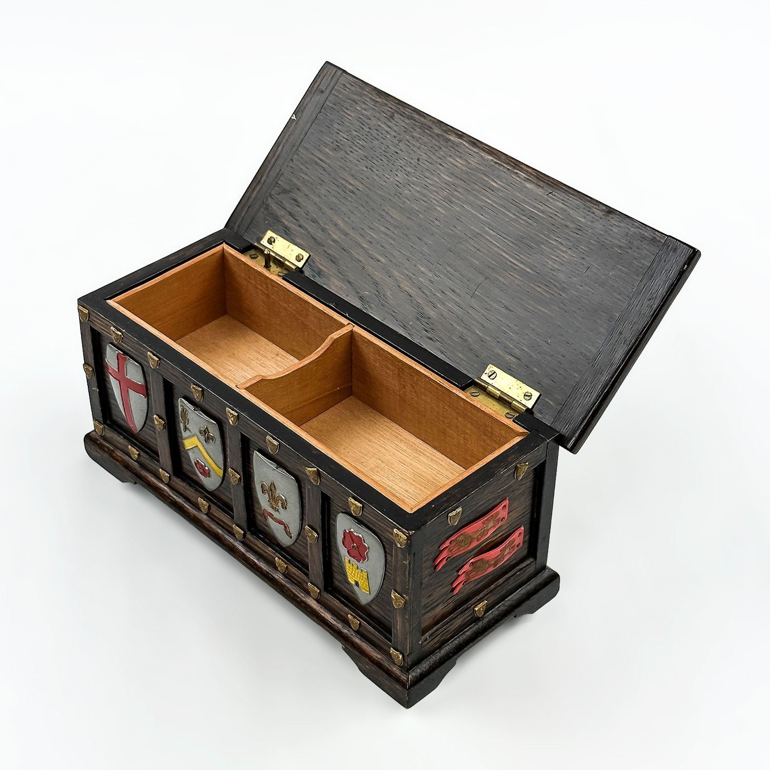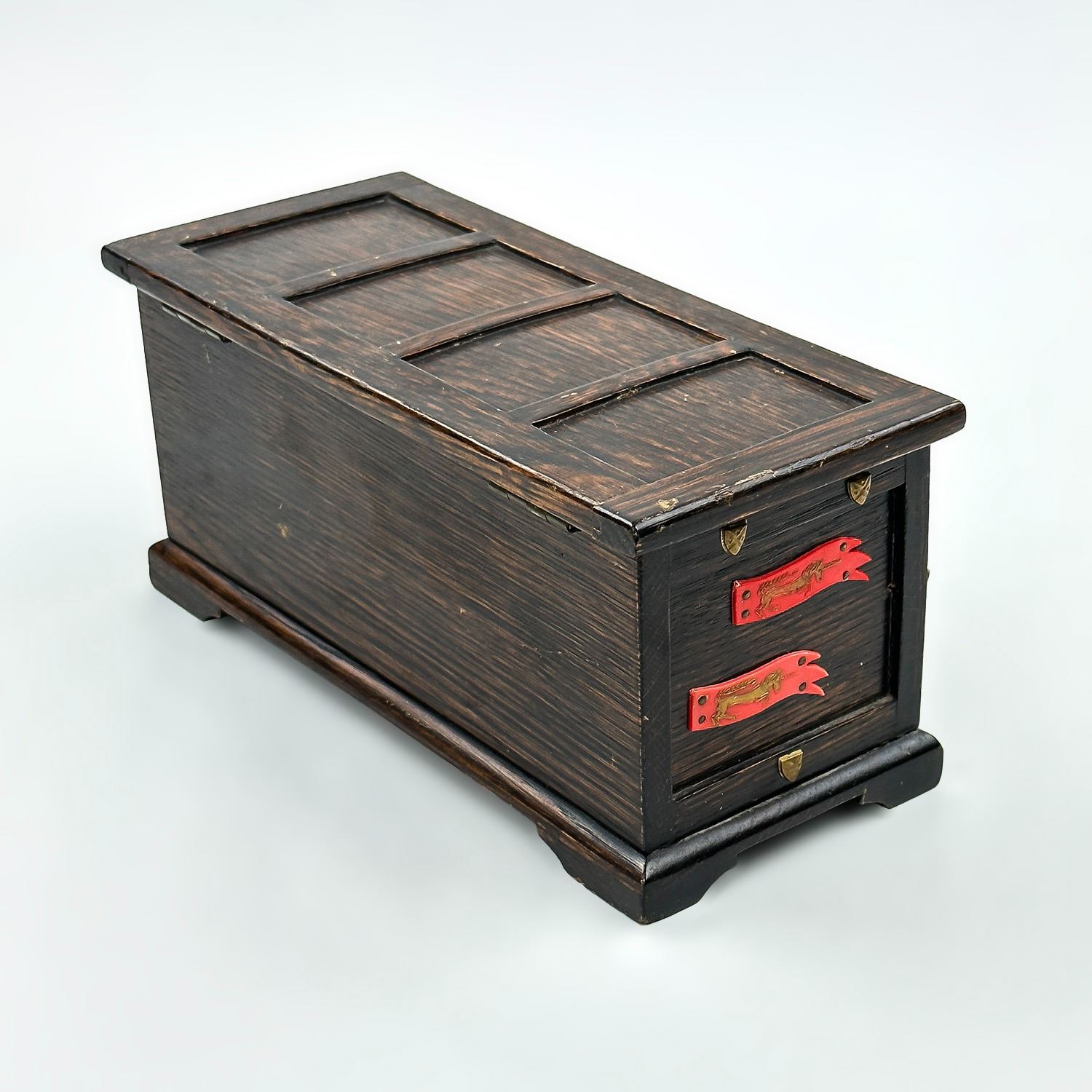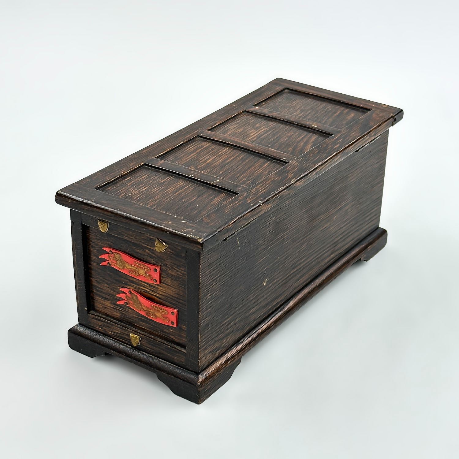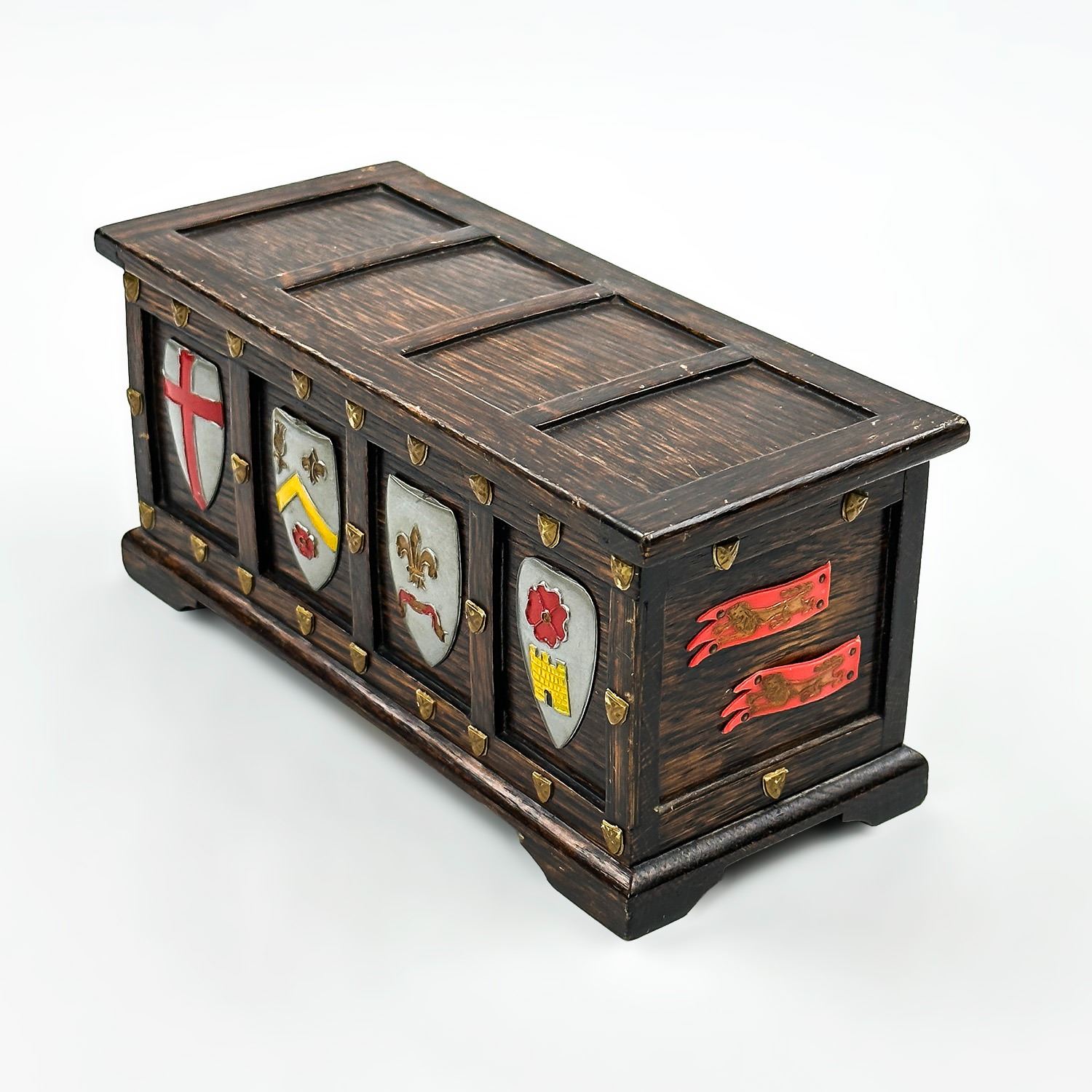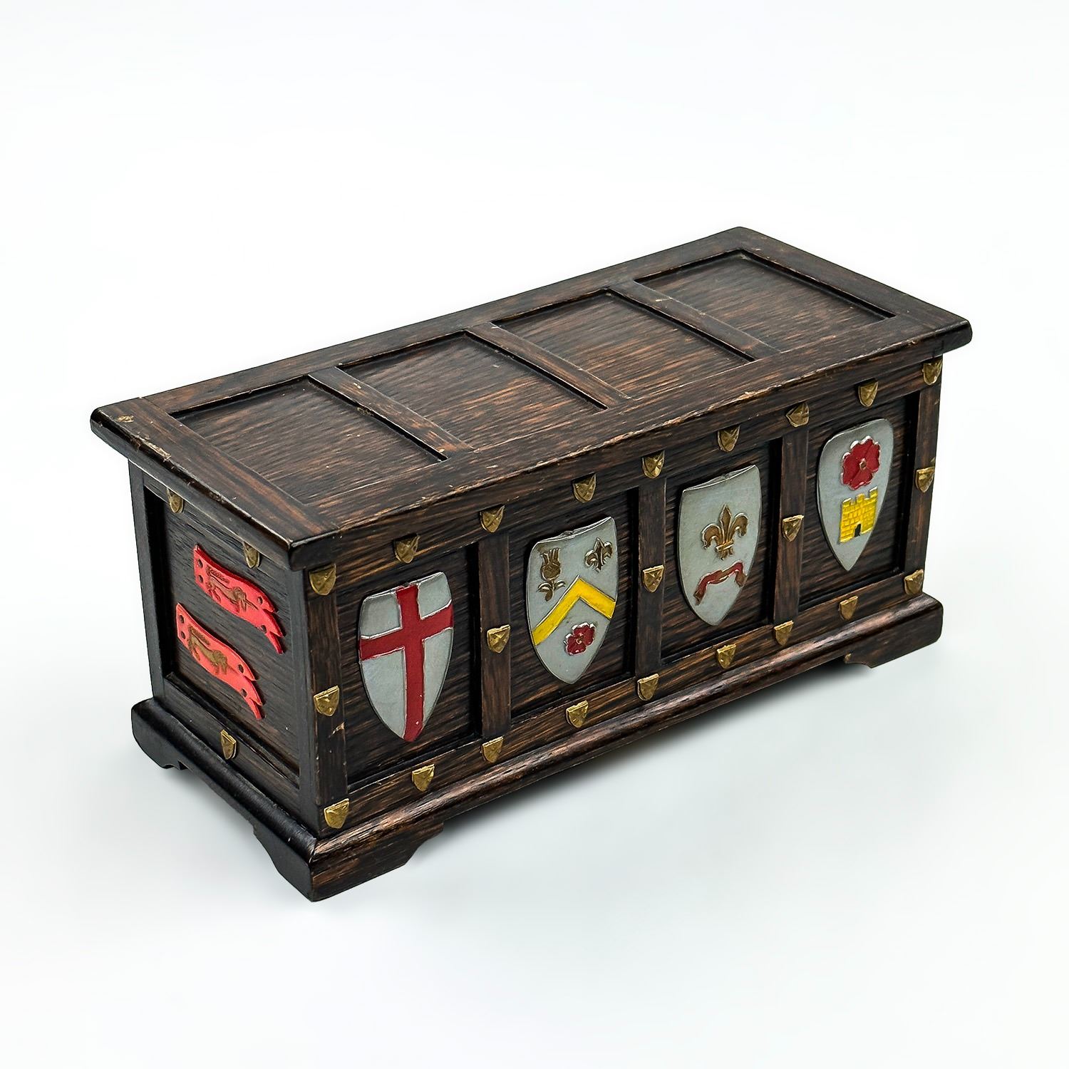 #8956 - WORKING WOODEN MUSIC BOX WITH HINGED LID. MADE BY TALLENT OF OLD BOND ST. - MADE IN ENGLAND. REUGE MUSIC MECHANISM PLAYS THE TUNE - GREENSLEEVES. WOOD BOX HAS A MEDIEVAL STYLE LOOK TO IT. MEASURES: 7.75” (19.5 CM) LONG BY 3.375”(8.5 CM) WIDE***ITEM(S) LOCATED IN LETHBRIDGE ALBERTA. FREE TRANSPORT TO EDMONTON OFFICE AVAILABLE FOR THIS AUCTION. WORLDWIDE SHIPPING IS AVAILABLE FOR ALL ITEMS