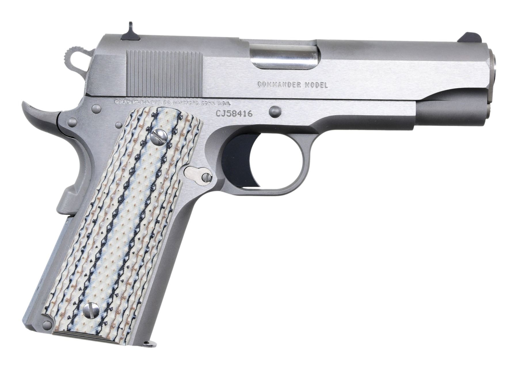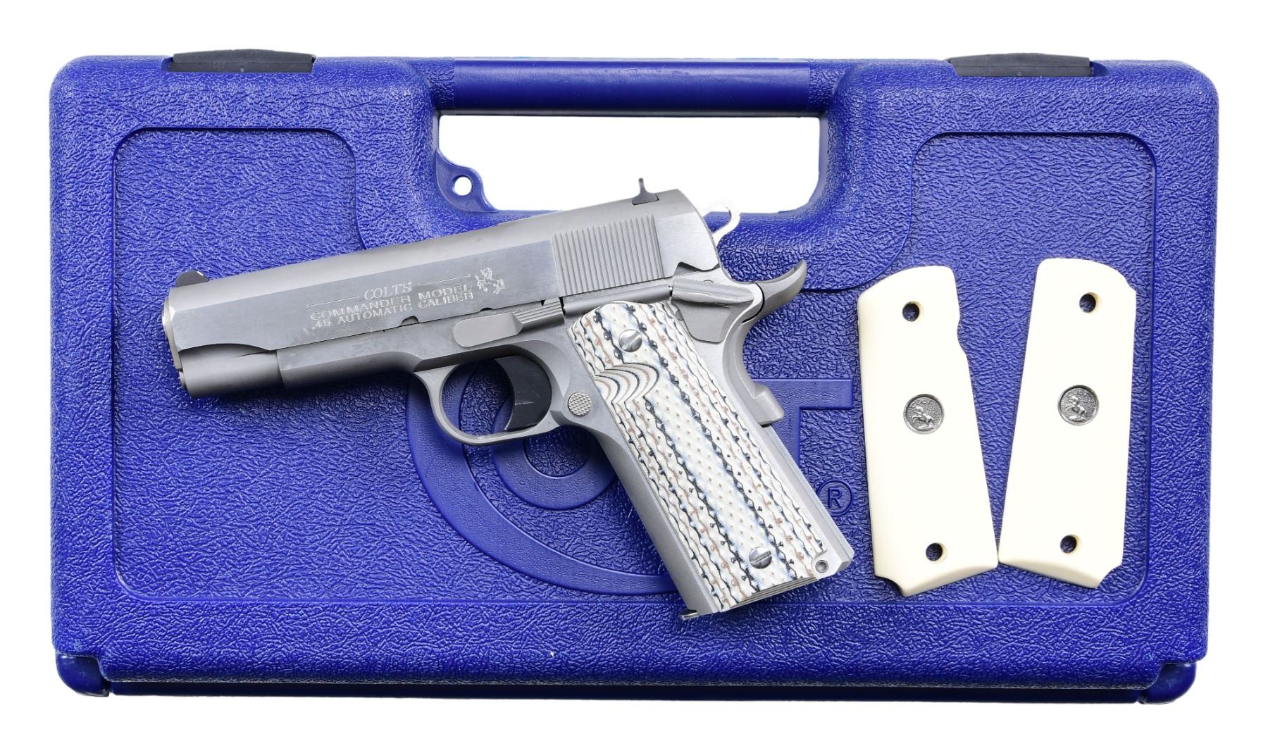 MATCHING FACTORY BOX. Cal. 45 ACP. S# CJ58416. Brushed stainless steel finished with 4.25" barrel. 3 Dot sights. Mil-Tex Marine G10 Grips. MAGS: 1 - 8 rd. CONDITION: blue box with paperwork, lock, hang tag & Ajax #12 white synthetic medallion grips. CONDITION: all aspects near excellent including bore. (25-649/MD). MODERN. $1,500-2,000.