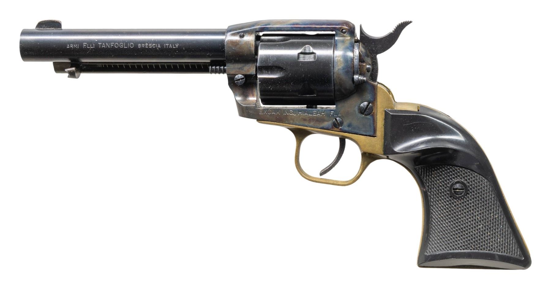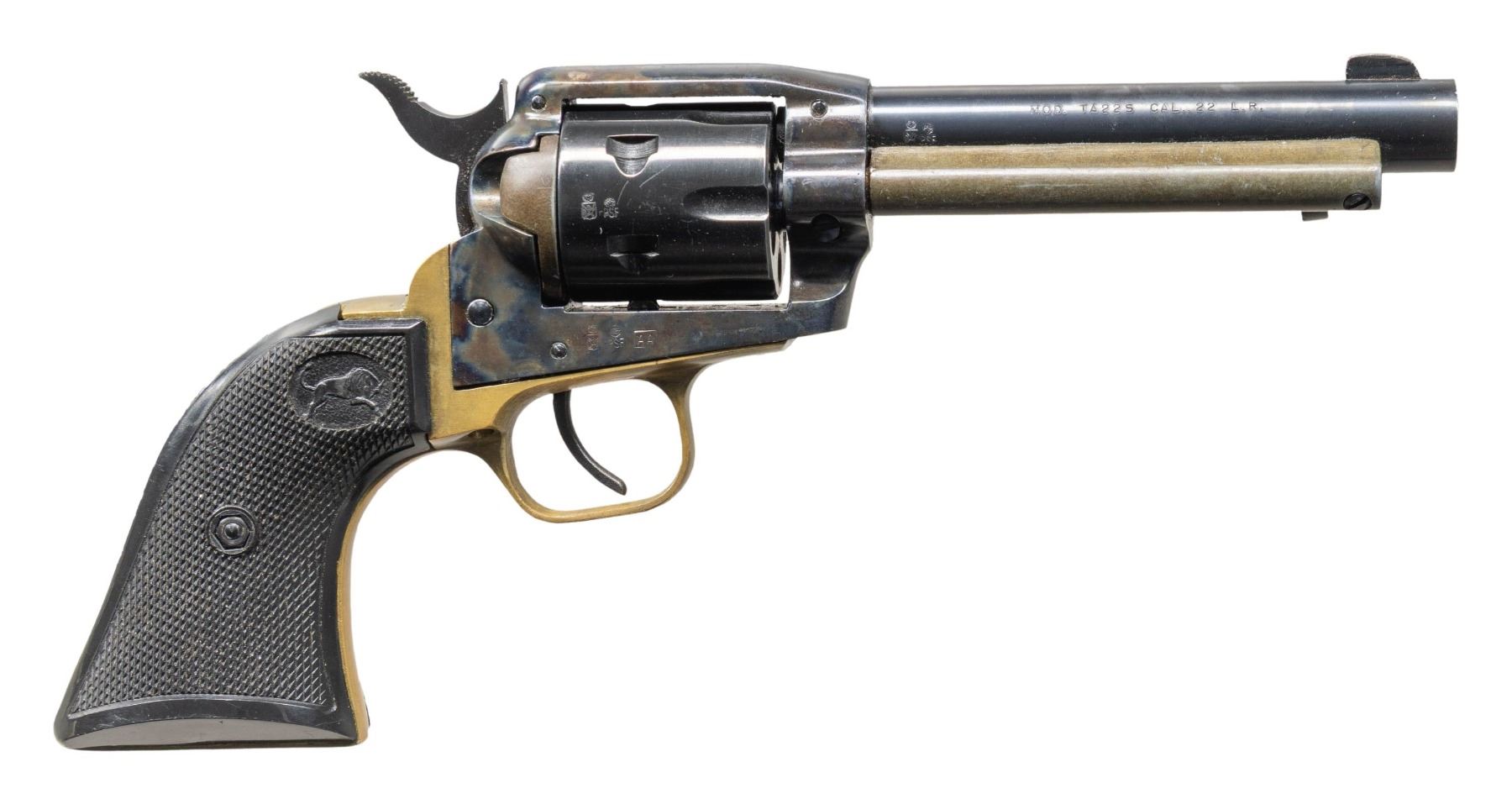 1) ARMI F.LLI TANFOGLIO TA22S RIMFIRE REVOLVER WITH HOLSTER RIG. Cal. 22 LR. S# 58918. Mfg. 1975 in Italy & imported by Excam Inc. of Hialeah, FL. Bbl. 4.75". 6 Shot cyl. Black plastic grips. UNATTACHED ACCESSORIES: black leather holster & belt with cartridge loops for 22 Mag. CONDITION: very good overall appearance with marks, & spots of patina. Very good rifling. (25-4455/MD). 2) RUGER SUPER WRANGLER CONVERTIBLE REVOLVER. Cal. 22 LR / 22 WMR. S# 209-15240. Shipping 2023 as Model 2034. Bbl. 5.5". Ramp front sight & adj. rear sight. Bronze Cerakote finish. 6 Shot cyls. Black checkered synthetic grips. UNATTACHED ACCESSORIES: 22 WMR cyl. CONDITION: all aspects near excellent including bore. (25-4537/MD). ALL MODERN. $400-600.