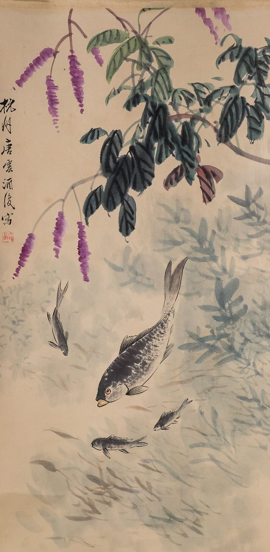 Swimming fishes, ink and watercolour on paper; signed Tang Yun (Chinese, 1910-1993) and inscribed with one artist seal; hanging scroll; 87 x 46 cm. Tang Yun was a Chinese painter known for his flower-and-bird subjects, landscapes, and portraits. Tang employed traditional Chinese painting techniques in new way to produce lively works, characterized by their focus on the natural environment. Born in 1910 in Hangzhou, China, he served as an apprentice to a number of traditional artists in his hometown before moving to Shanghai in 1938. Here, the artist taught at the Xinhua Art Training School and the Shanghai Fine Art Training School. Tang died in 1993 in Shanghai, China. PROVENANCE: T. Ng Collection, Toronto