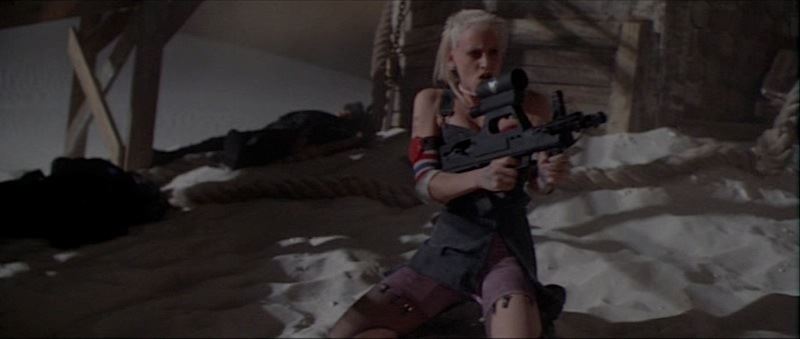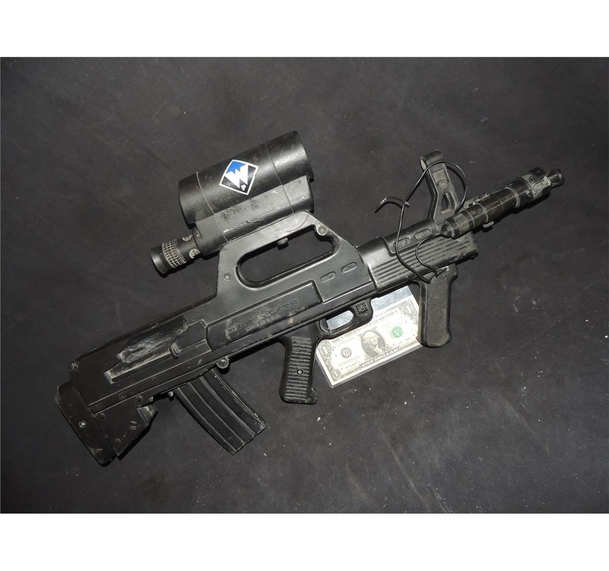 This is the assault rifle used by Lori Petty in the cult classic TANK GIRL! It is made of dense rubber with a metal core and features a large scope, with rubber "flashlight" and "laser" attachments with wires connecting them to the body of the rifle. The sides of the scope have Water and Power logo stickers applied. The gun measures 28" in length and has wear consistent with use.