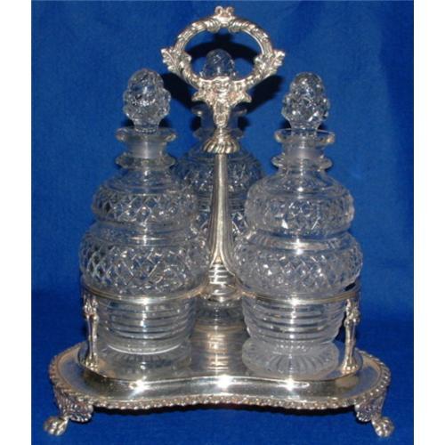 An Extremely Impressive Three Bottle Wine or Spirits Table Tantalus complete with original deep hand cut crystal Bottles (possibly Irish crystal) on shaped frame with gadrooned edge of silver plate on copper raised on three ornate supports with claw feet. First quarter of 19th Century. <p> NOTE: RareTantalus with three unusual stopper holders beside each bottle only found in early examples.
