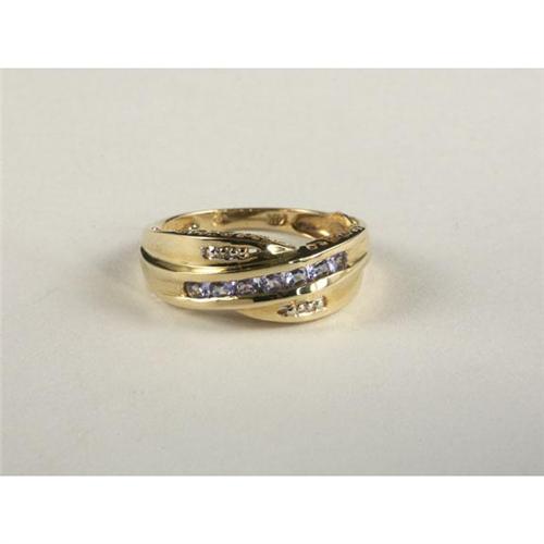 RING: Contemporary 14k yellow gold lady's ring channel set with round cut tanzanite and accented with round cut diamonds. The purplish blue tanzanite measures approximately 0.30 ctw and is transparent. The diamonds measure approximately 0.01 ctw, have SI2 clarity and I color. Appraisal included.