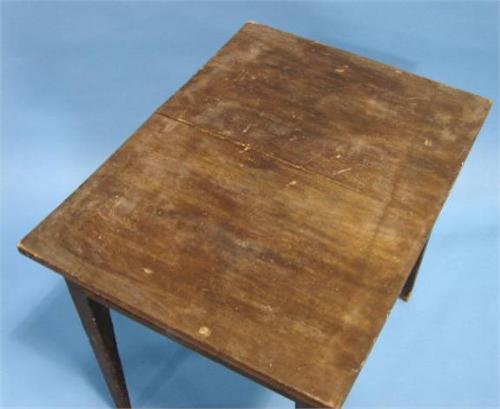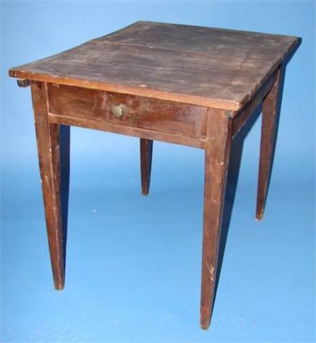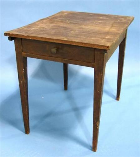 SINGLE DRAWER WORK TABLE. Tapered legs. Has single dovetailed drawer. Has two board top. Shows wear throughout. 24” H, 20.25” x 26.75”
