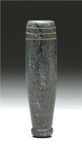 TAPERED STRAIGHT TUBE PIPE. With incised lines around bowl. Black steatite. Late Archaic to early Woodland, Circa 1000BC style-500AD style. SIZE: 5-1/4in. l x 1-1/2in. w. CONDITION: Very good. 9-25984-91 The Tennessee Collection of Prehistoric Indian Artifacts from the Allen Graves Estate. SPECIAL NOTE: We do not regularly sell Prehistoric Indian stone artifacts and therefore have very little experience and no expertise in this area. All of the following lots have come from the Collection of the Late Allen Graves of Tennessee. The collection was inherited some years back by his daughter, who now lives in Maine. This collection was consigned to us directly from her. We employed someone to generally identify styles and types, but as stated above, due to our lack of expertise in this field, we can not guarantee the age or origin of the following pieces. We are relying on you, the buyer, to determine to your satisfaction the origin and age of each item in the collection.