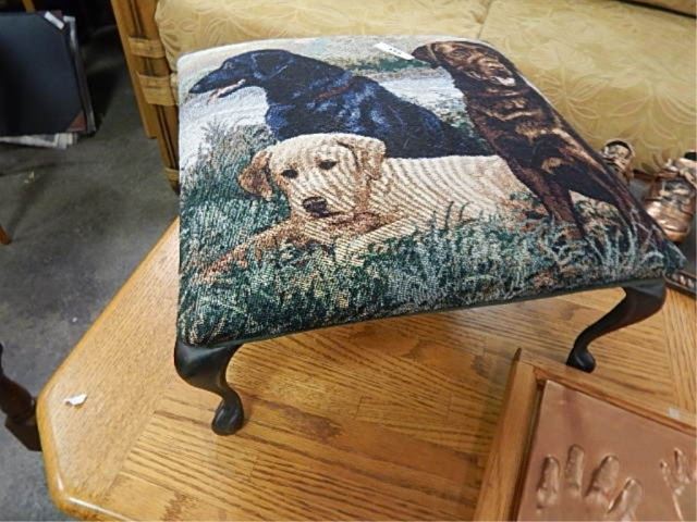 TAPESTRY COVERED STOOL WITH CAST IRON QUEEN ANNE FEET