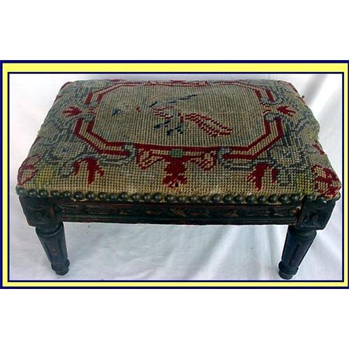 <table width="100%" border="0" cellspacing="0" cellpadding="4"><tr><td><em> </em></td></tr><tr> <td width="100%"> Victorian carved wood footrest stool with handworked needlepoint tapestry. 19th century, most likely American.<BR>7inches high. 13 inches accross.<BR>Simple small stool / footrest. Handworked tapestry in reds, green, blue and yellow. Floral patterns surrounding a reserve with a bird, somewhat faded, but still quite visible. Attached with old round tacks. One side is frayed and stuffing is coming out - see photo. Underneath stool, crack in wood is also shown in the photos.<BR>Original stuffing. </td></tr><tr> <td> </td></tr><tr> <td>Reference #: 2309</td></tr><tr><td>Condition:See Description</td></tr><tr><td>Year:See Description</td></tr><tr><td>Title:TAPESTRY HANDWORKED BIRD WOOD STOOL</td></tr><tr><td>Location:Boca Raton</td></tr></table>