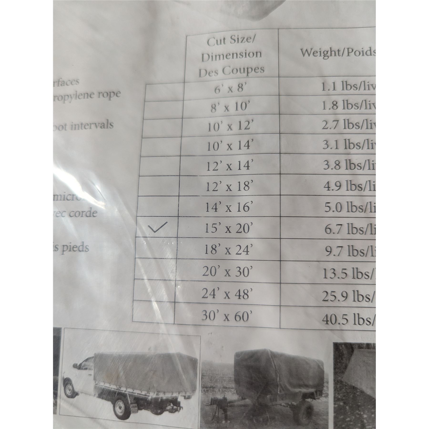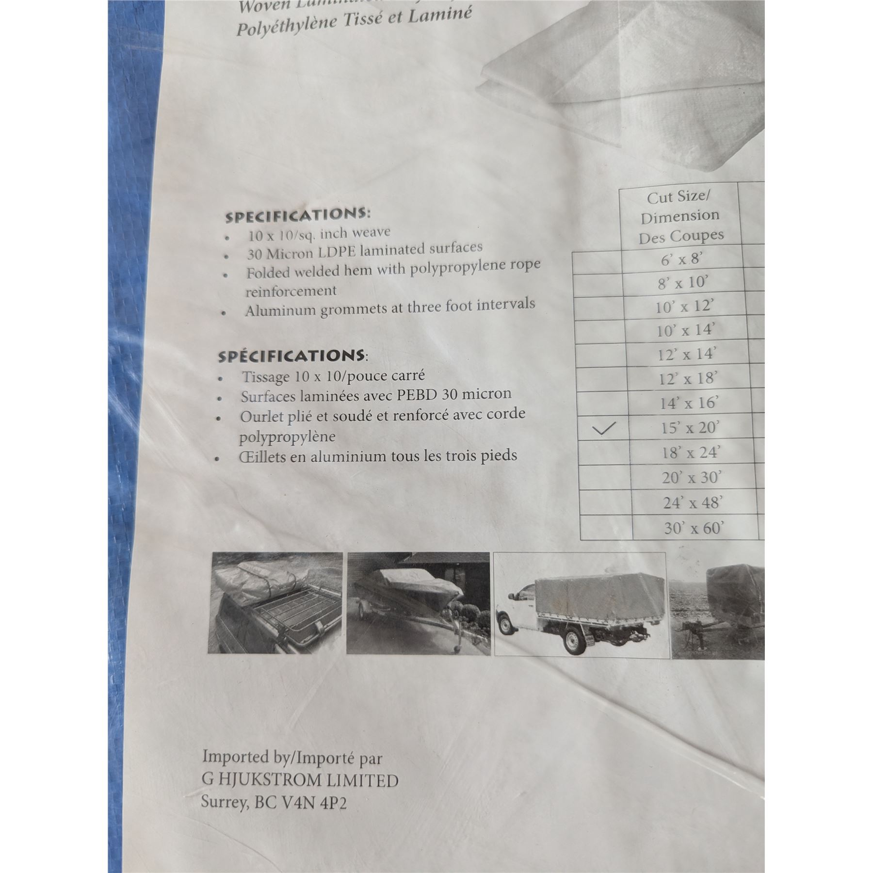 GH Woven Laminated Polyethylene blue tarp. Measuring 15'x20". Aluminum grommets at 3' intervals. 10 x 19/sq.inch weave, 39 Micron LDPE laminated surfaces. Folded plastic welded hem with polypropylene rope reinforcement.