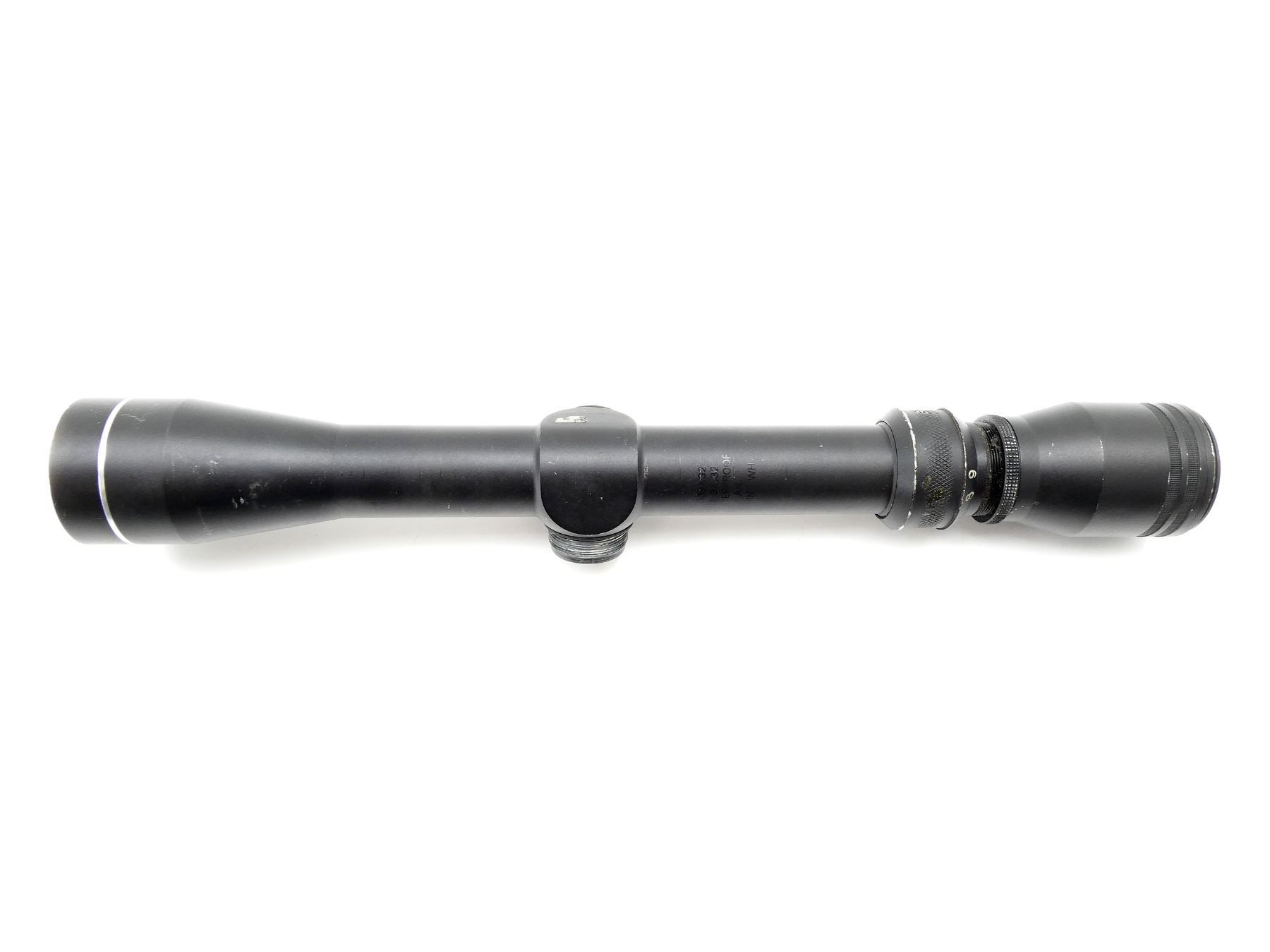 (1) CLEAR OPTICS, DUPLEX CROSSHAIR RETICLE, 1" TUBE DIAMETER, WORKING MAGNIFICATION RING, WINDAGE & ELEVATION KNOBS TURN, MISSING CAPS, MARKED: "TASCO", "PH39X32", "3X-9X, 32", "WATERPROOF", ETC., WITH NON-FITTING LENS COVERS, SHOWS WEAR & TEAR / USE MARKS. SEE PHOTOS.