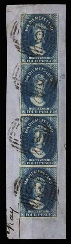 1857-60 wmk Double-Lined Numeral 4d blue (SG 35) deepish shade, vertical strip of 4, close to large margins except just cutting bottom right side of 3rd stamp down, each individually tied by "68" numeral to small piece, small corner fault to top left stam