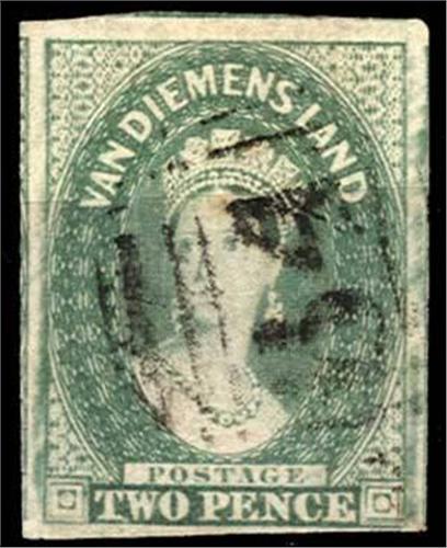 1856-57 no watermark 2d dull emerald-green (SG 20) used single, enormous margins on 3 sides showing portions of adjoining stamps, large to small (bottom right) along bottom margin, numeral cancel, very fine and scarce, ex Caspary and Robinson