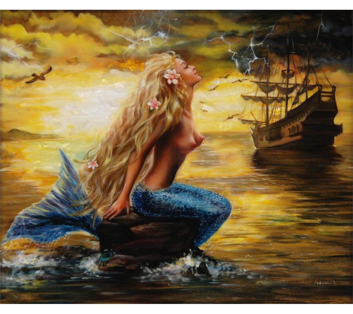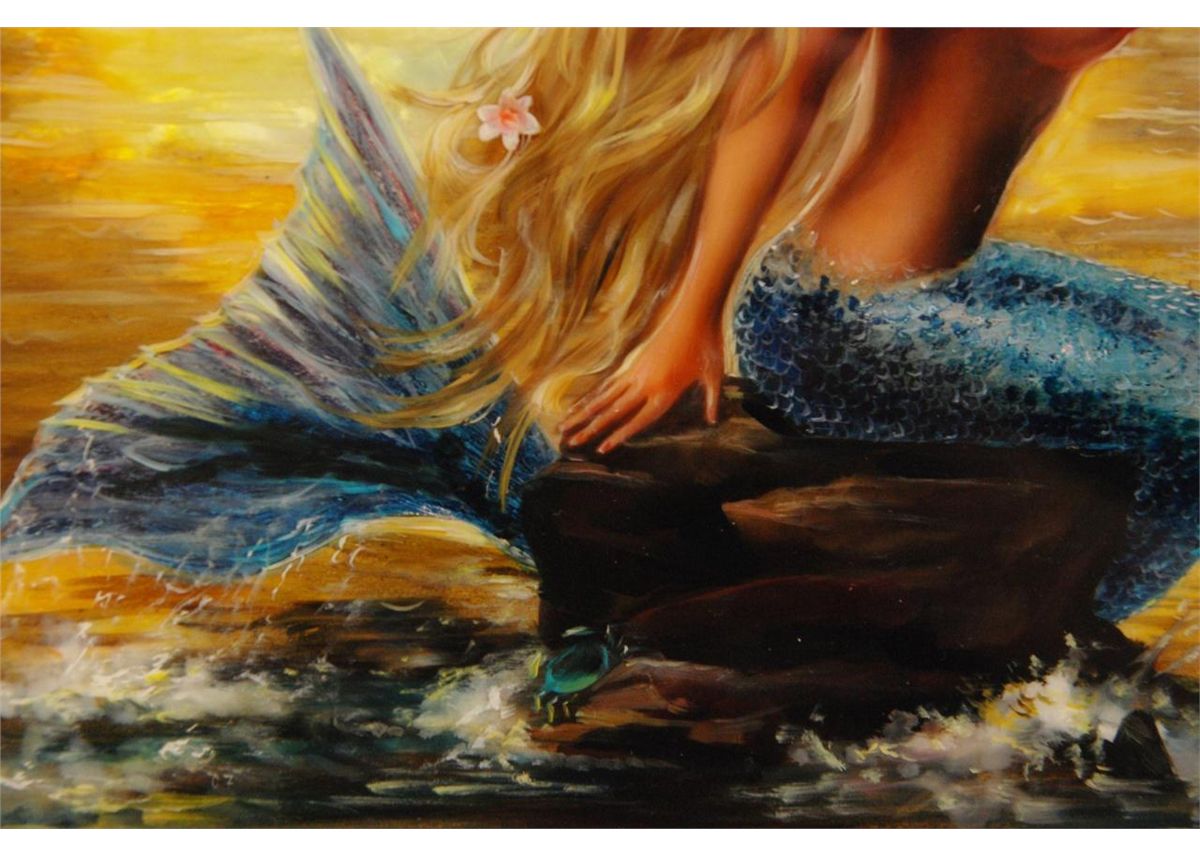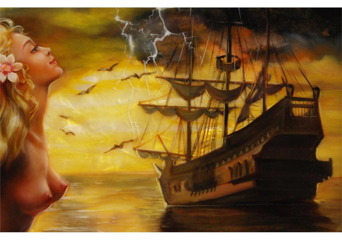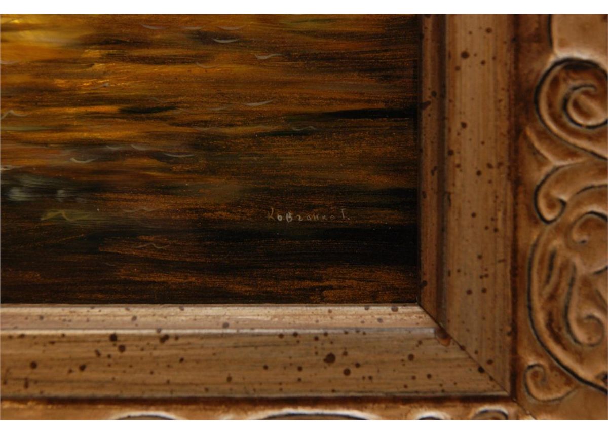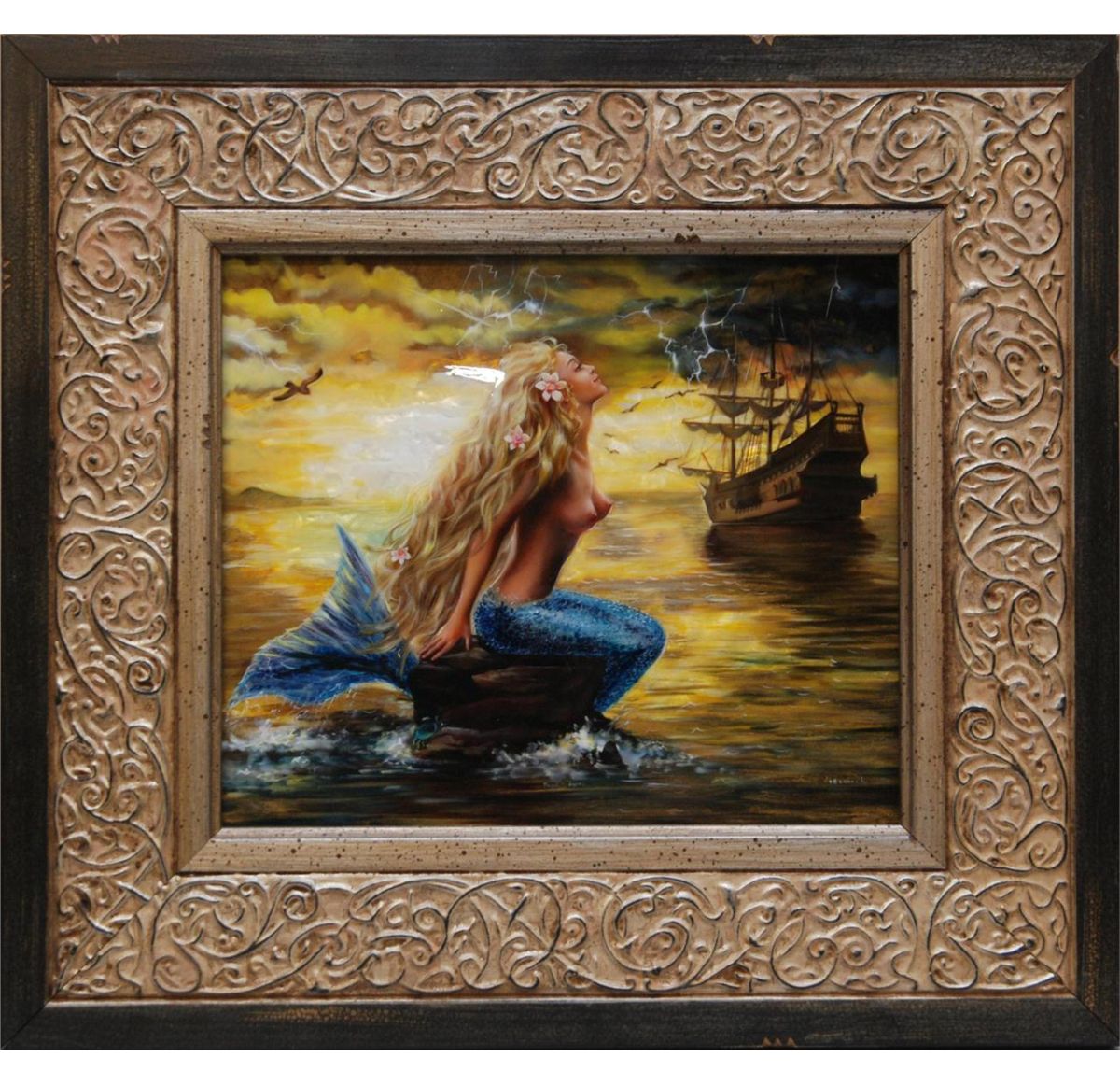 Tatiana Kovgenko (RUSSIAN, 20th century) hand painted plaque depicting a mermaid on rock with a ship to the background. Signed lower right and titled to center in Cyrillic. Mounted in wooden scrolled frame. Measures 10" height x 12" width + 3 3/8" frame (25.4cm x 30.4cm + 8.5cm).