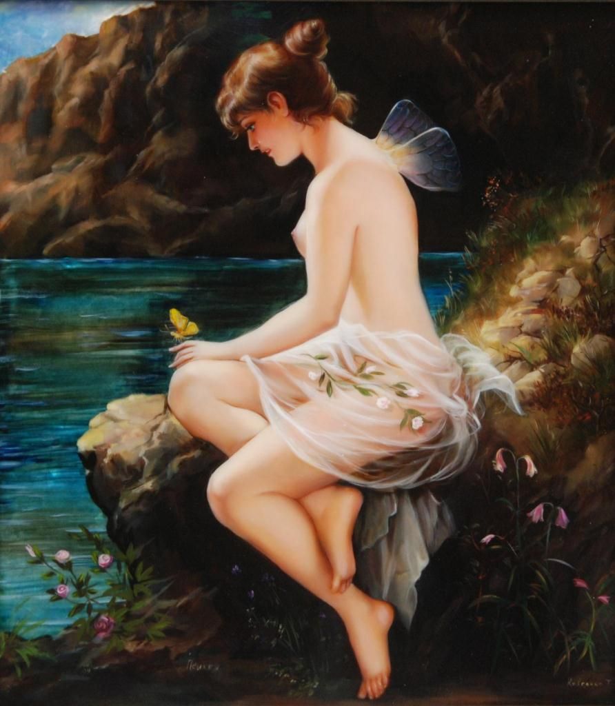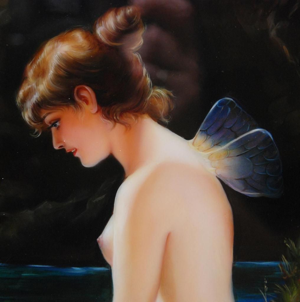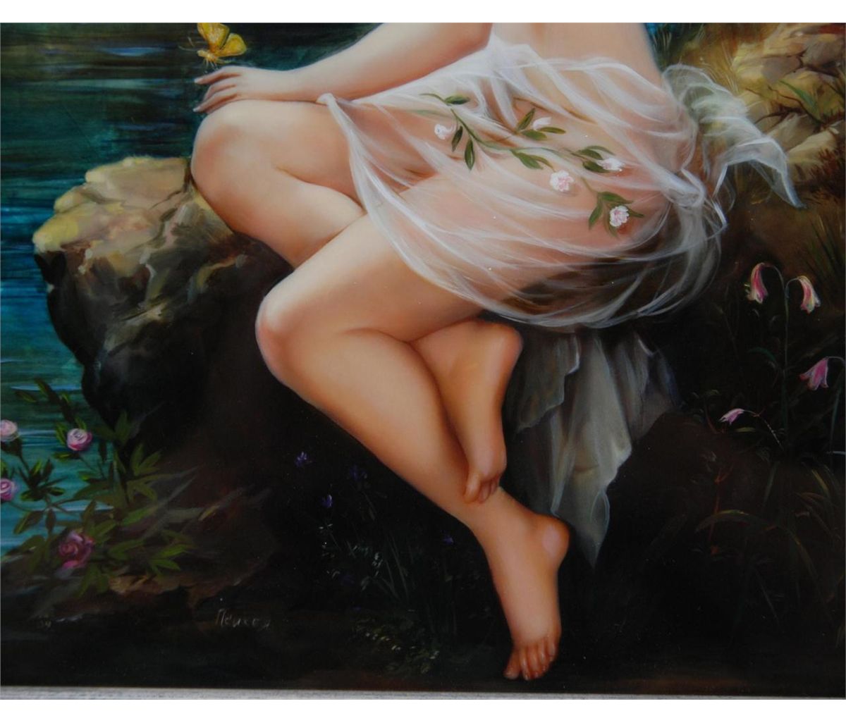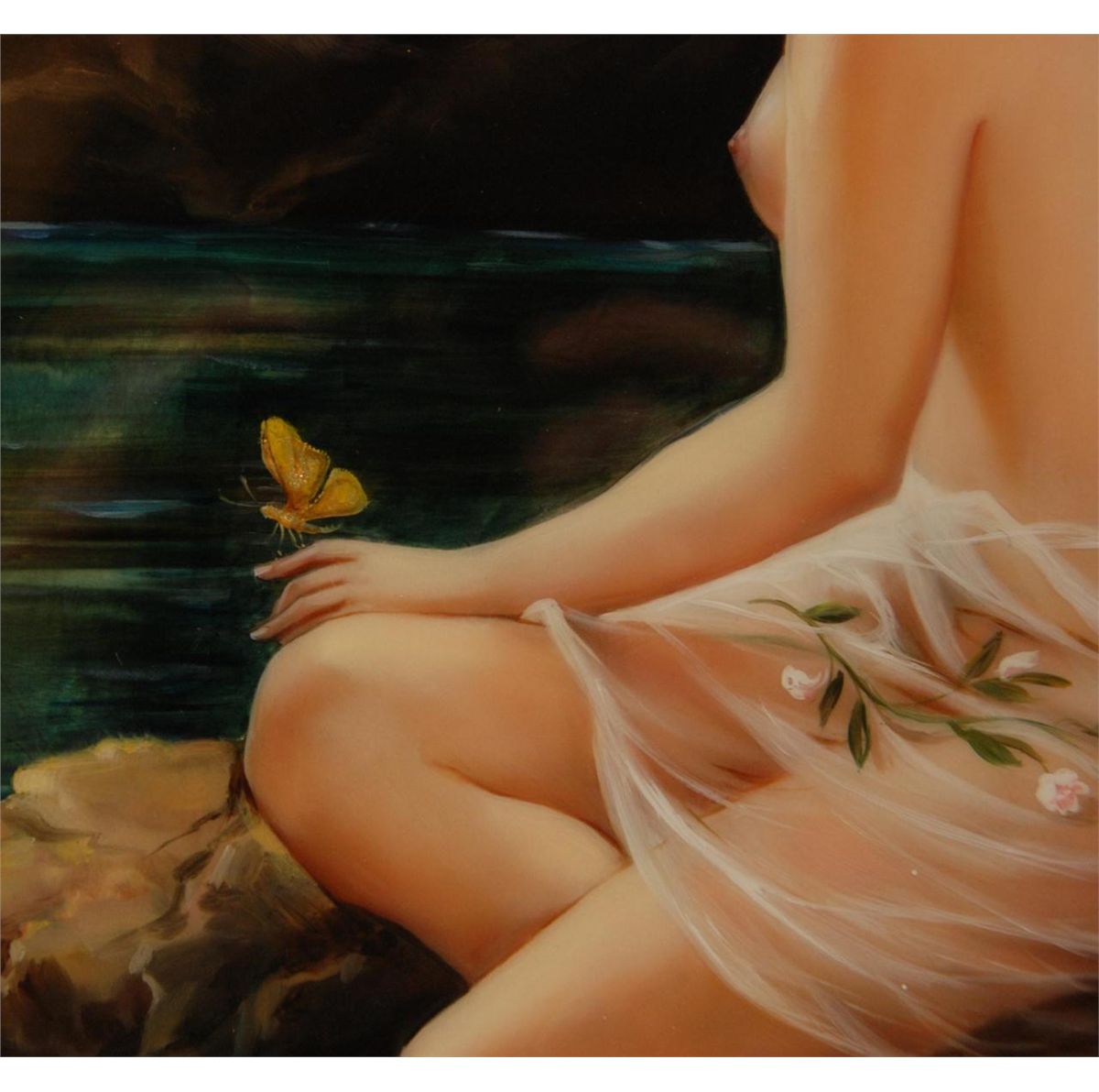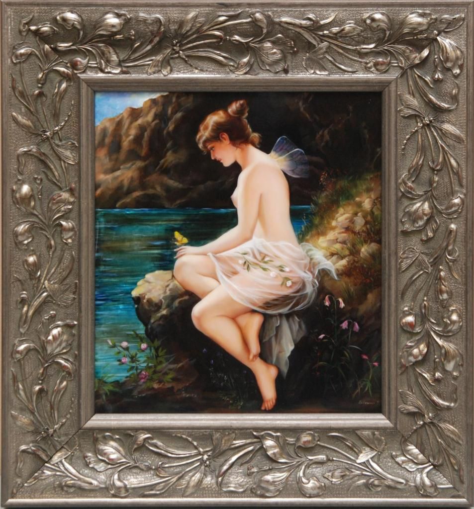 Tatiana Kovgenko (RUSSIAN, 20th century) hand painted plaque depicting nymph Psyche as she longs for cupid after the original work by Wilhelm Kray (GERMAN,1828–1889). Signed lower right. Mounted in wooden floral frame. Measures 12" height x 10 5/8" width + 3" frame (30.4cm x 26.9cm + 7.6cm).