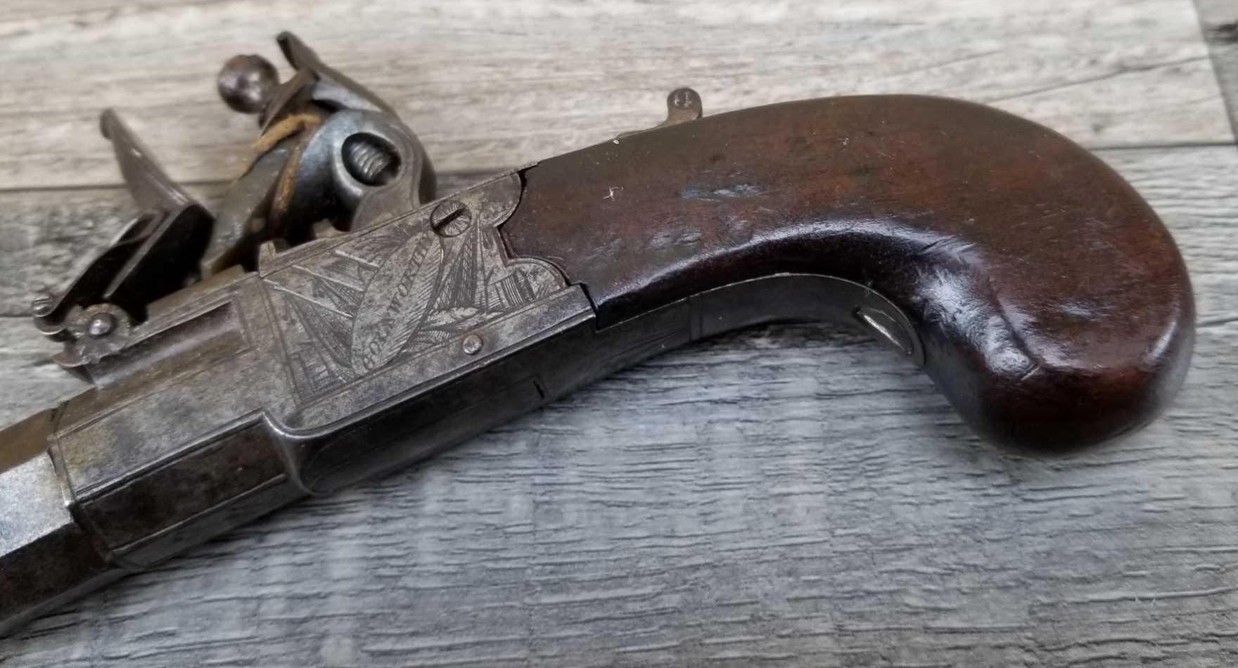 BOAT SCENES ENGRAVED IN RECEIVER. BARREL COMES OFF EASILY. LOOKS TO BE IN GOOD WORKING ORDER. TRIGGER FOLDS DOWN WHEN HAMMER COMES BACK. LEFT SIDE MARKED "GOLSWORTH".