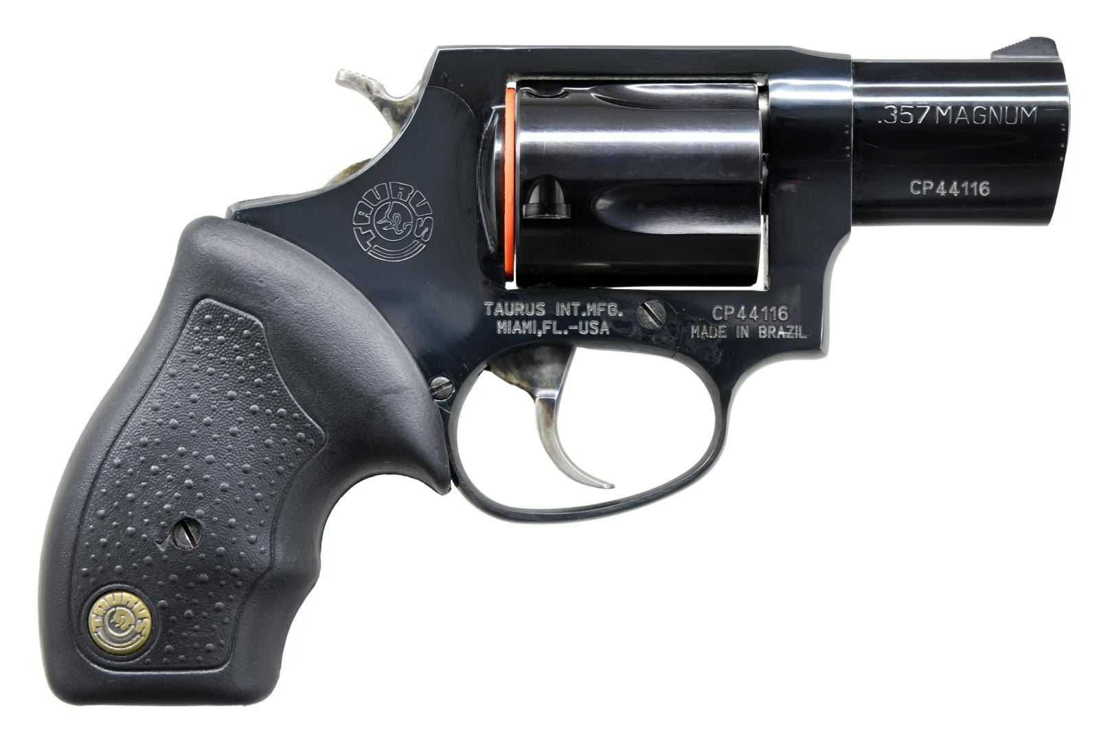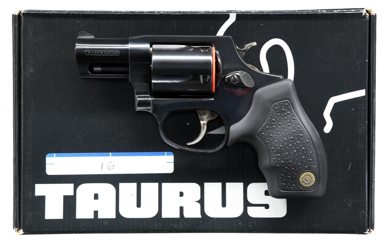 Cal. .357 Magnum. S# CP44116. Bbl 2". Model 605 manufactured in Brazil and imported by Taurus International Manufacturing of Miami, FL. Blued finish with Taurus medallion 2 piece textured black rubber grips. Serrated ramp front sight with frame notched rear sight. UNATTACHED ACCESSORIES: matching factory cardboard box. CONDITION: metal components retain virtually all of their original factory blue finish, exhibiting a layer of factory grease and a few mild superficial marks from storage and handling. Cylinder bears a light dragline. Mirror bore, exhibiting well defined rifling throughout. Grip is excellent. Box shows some mild exterior wear, but is otherwise sturdy and serviceable. (23-2483/MLW). MODERN. $300-500.