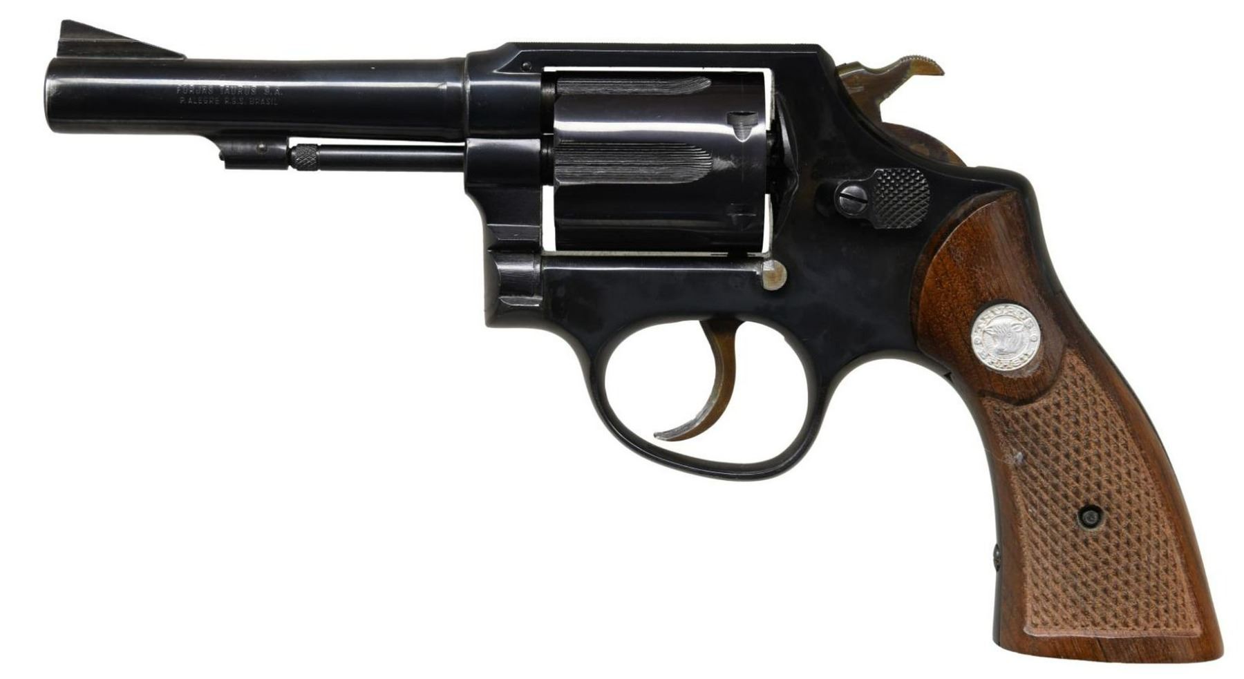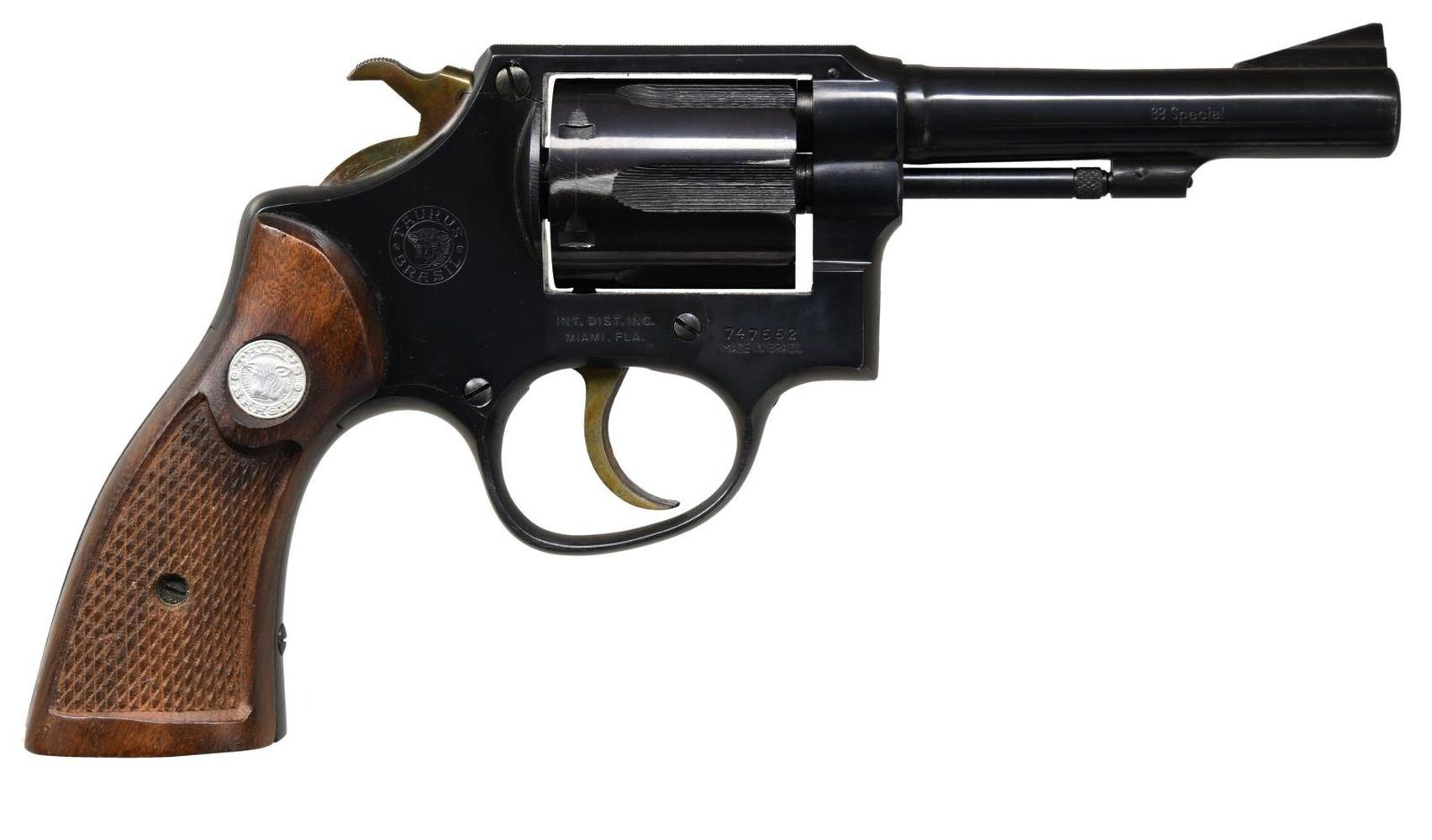 Cal. 38 Spcl. S# 747662. Bbl. 4". Ramped serrated blade front sight. Fixed rear sight. Blued finish w/ strawed trigger & hammer. Operation is a bit siff when hand cycled. Checkered hardwood grips w/ silver Taurus medallions. CONDITION: grips show a couple light chips, some dings & handling wear. Trigger & hammer retain much of their straw finish w/ some oxidation & operational wear. Balance of metal retains 85% original blue w/ some operational, handling & edge wear. Very good bore. PROVENANCE: the Collection of Gun Sport Ltd owned by Jon R. Thomas. (23-4455/MJC). MODERN. $300-450.