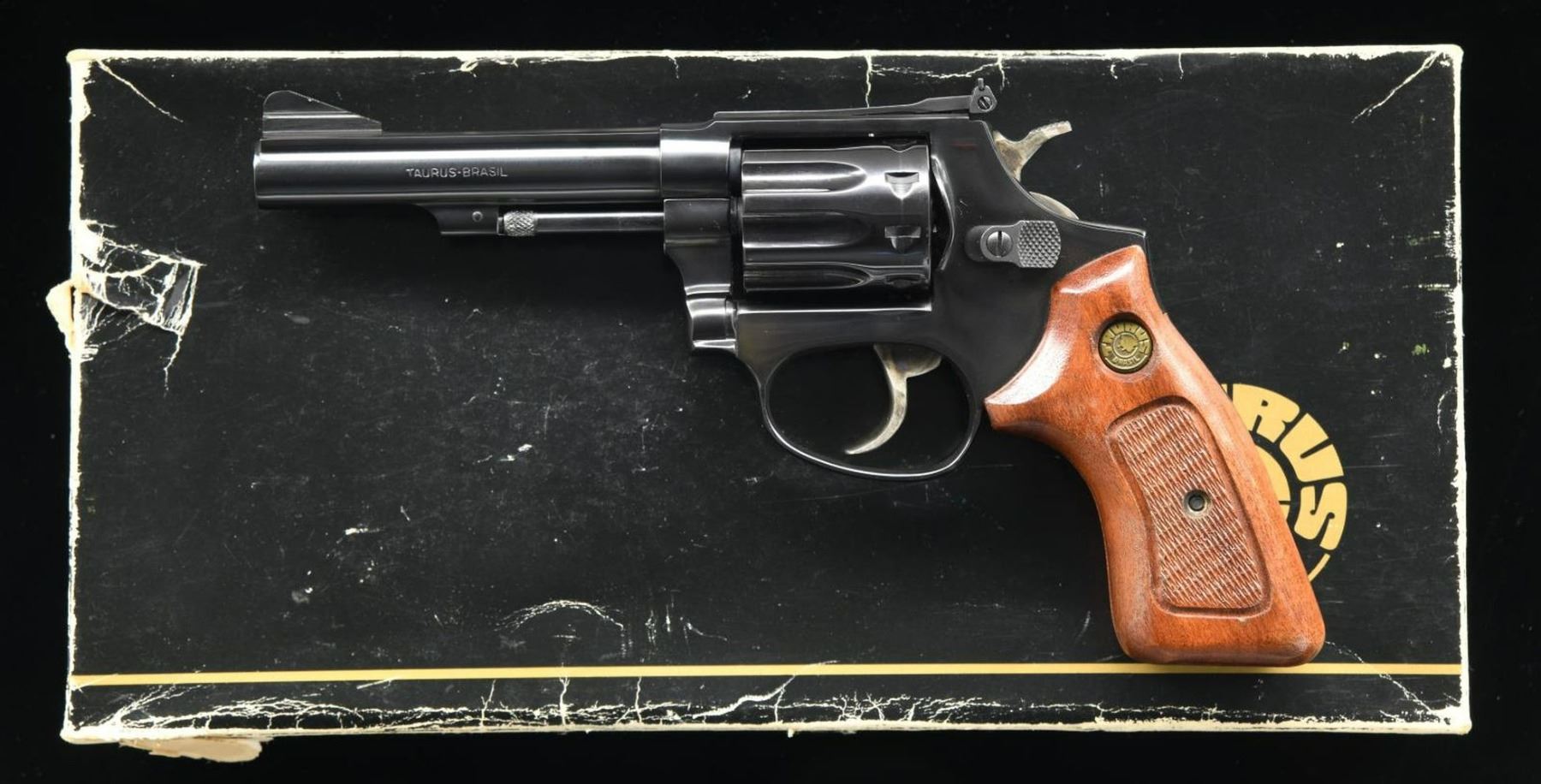 Cal. 22 LR. S# LG89380. Bbl. 4". Ramped serrated blade front sight. Adjustable square notch rear sight. Nine shot cyl. Blue finish w/ case colored trigger & hammer. Checkered hardwood grips w/ Taurus medallions. UNATTACHED ACCESSORIES: matching numbered factory box in fair condition w/ foam inserts & manual. CONDITION: hammer, trigger & cyl. show light operational wear. Other aspects rate very good plus or better. (23-5211/MJC). MODERN. $200-300.