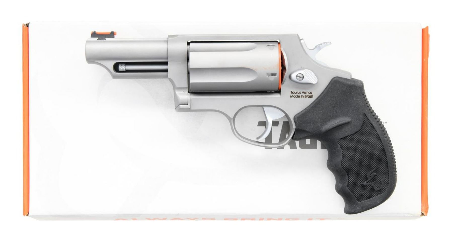 Cal. 45 Colt/410. S# ADC080082. Bbl. 3". Fiber optic front sight. Fixed rear sight. 2 1/2" chambers. Stainless finish. Black finger groove grips w/ Taurus logo. UNATTACHED ACCESSORIES: matching numbered factory box w/ manual, paperwork & keys for internal locking system. CONDITION: all aspects rate very good plus or better. PROVENANCE: the Collection of Gun Sport Ltd owned by Jon R. Thomas. (23-3994/MJC). MODERN. $400-700.
