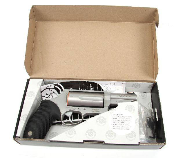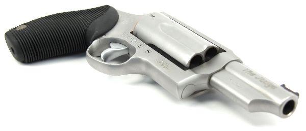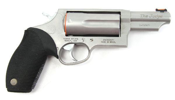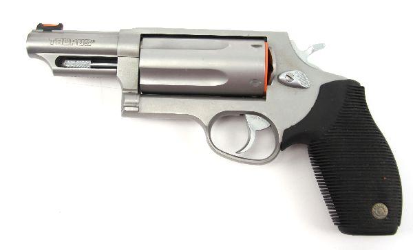 The Judge, by Taurus .410 / .45LC revolver. Magnum chambered for 3 inch .410 shells, as well as 2 3/4 inch .410 and .45LC. Stainless finish, with 3 inch barrel. Gun is overall 95%, showing very little use. original box and paperwork included. Excellent condition. Caliber: .410 Serial #: DW303671
