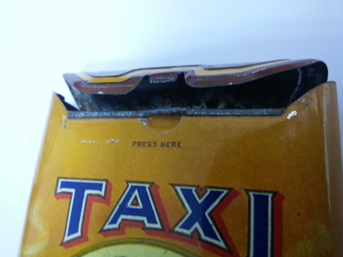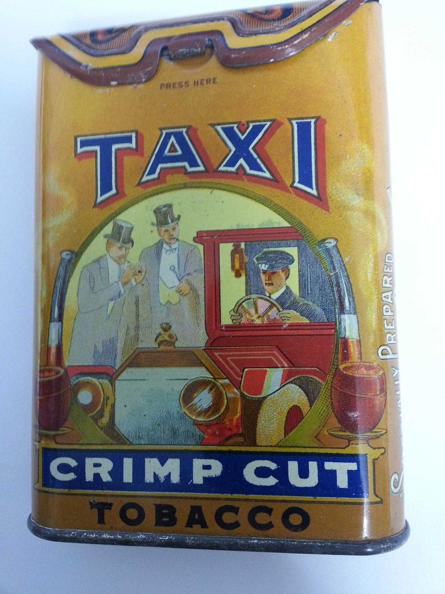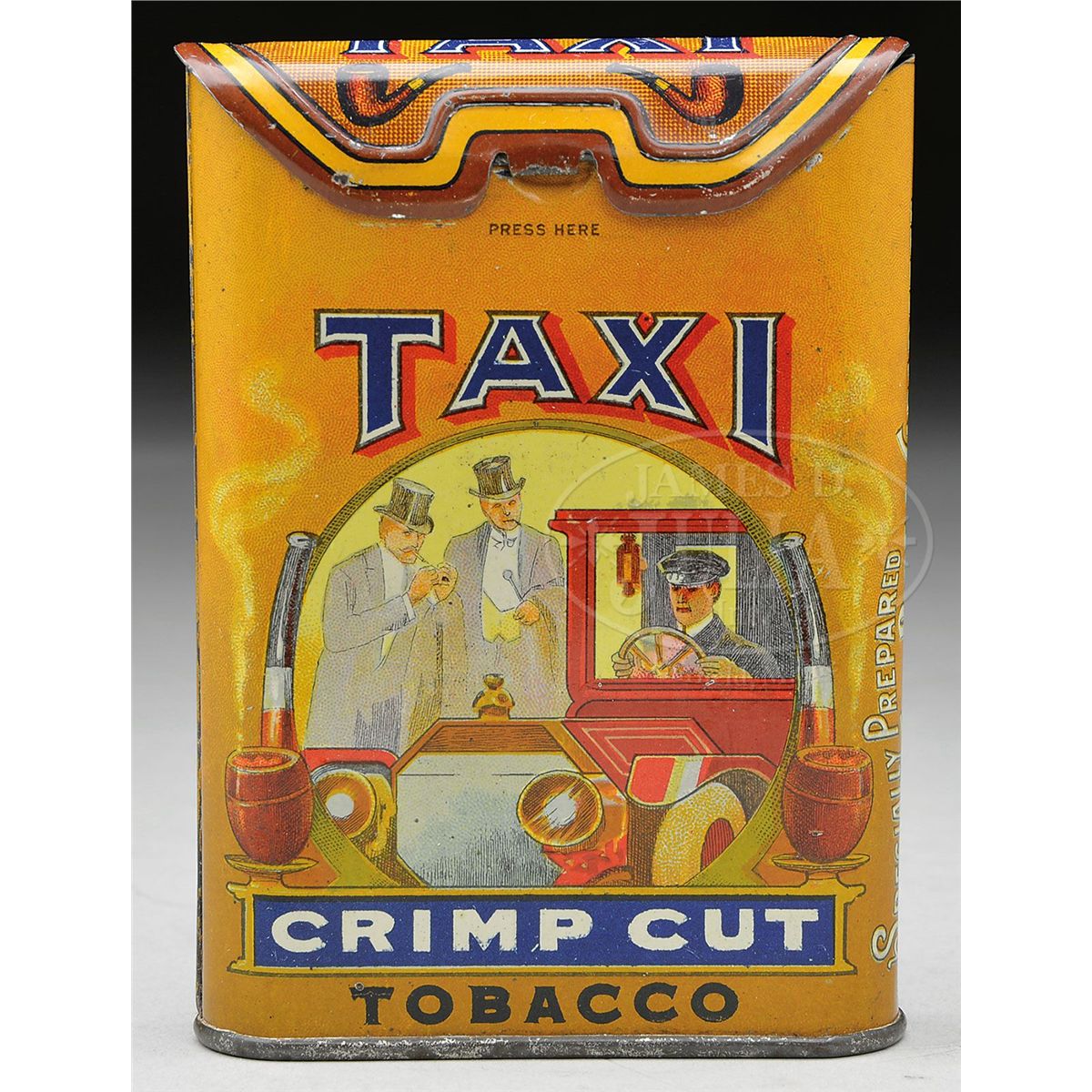 One of the Holy Grails to tobacco tin collectors. This embossed roll top tin has taxi cab graphics on both sides. SIZE: 4-1/4" t. CONDITION: Near excellent; wonderful original surface sheen; only minuscule wear to relief hinge areas and the embossed lid front. 1-13226-1