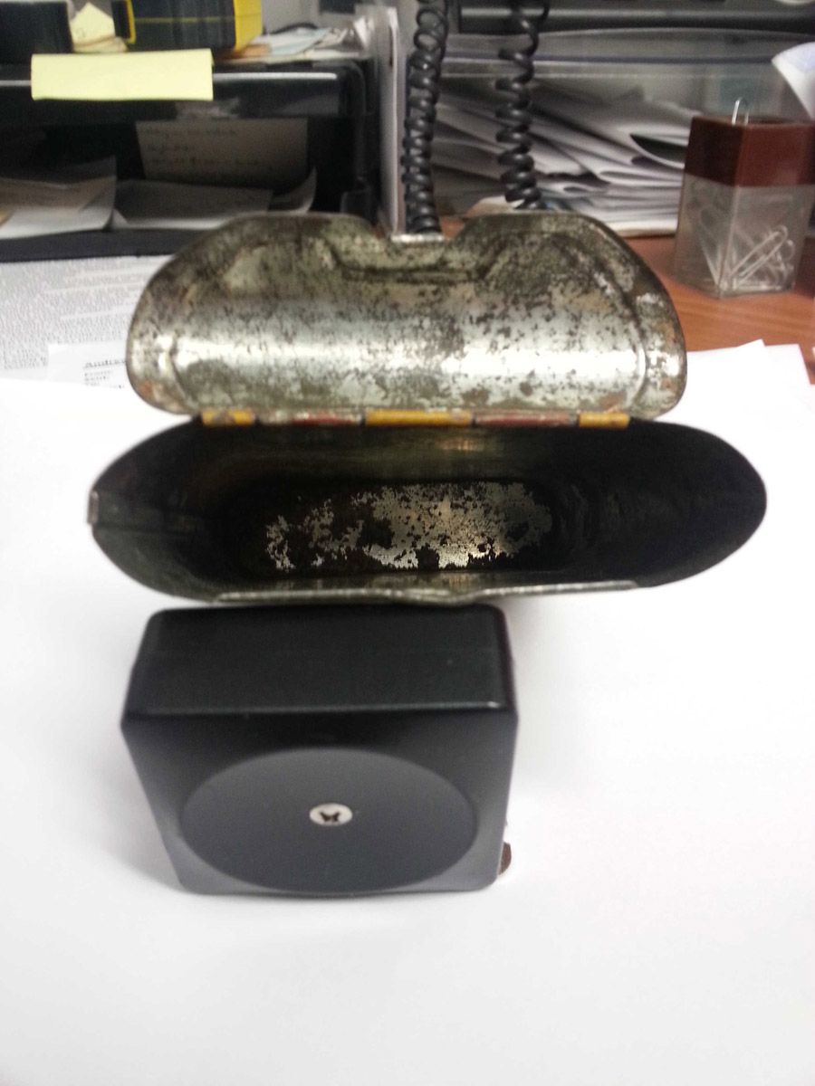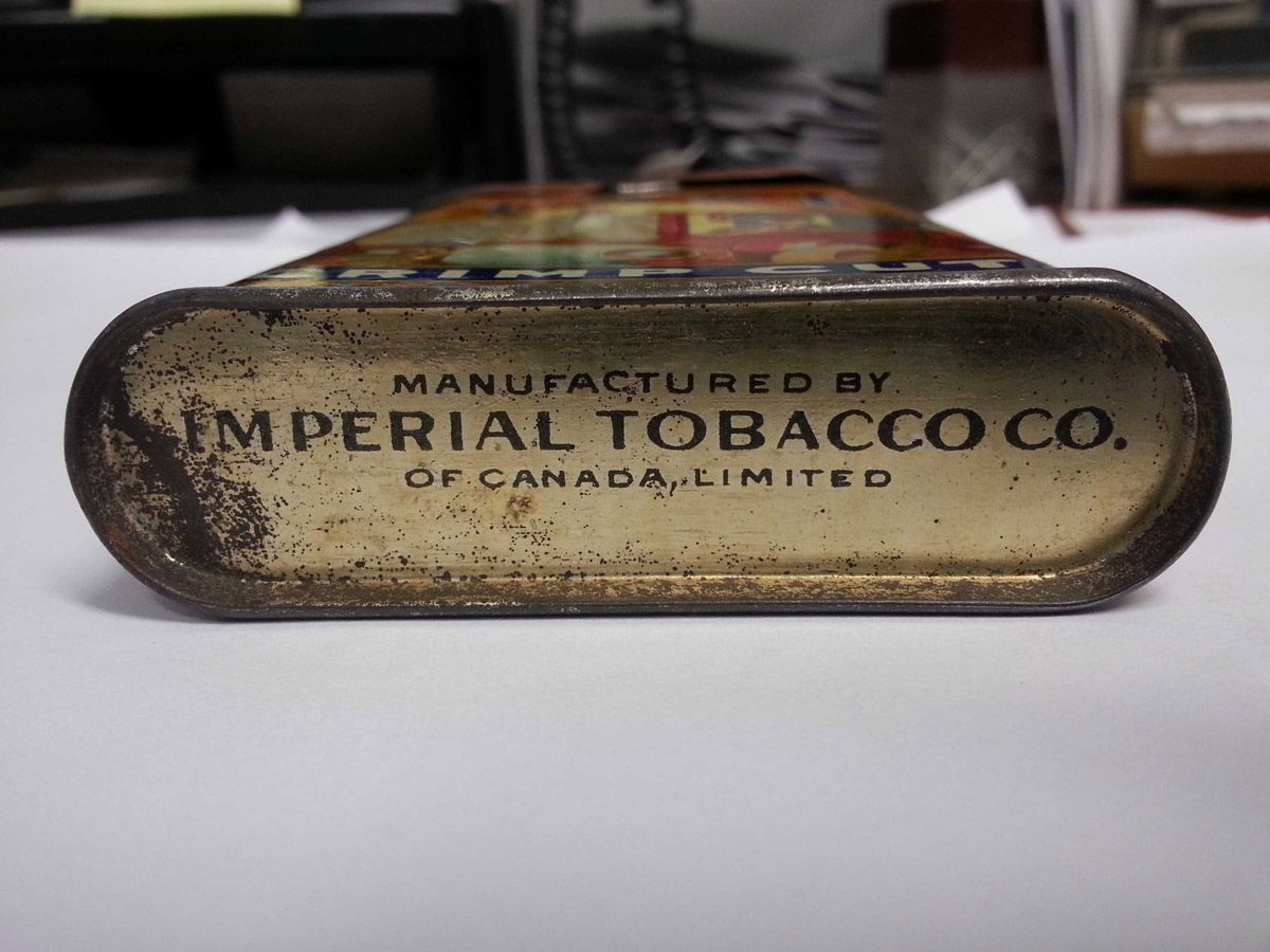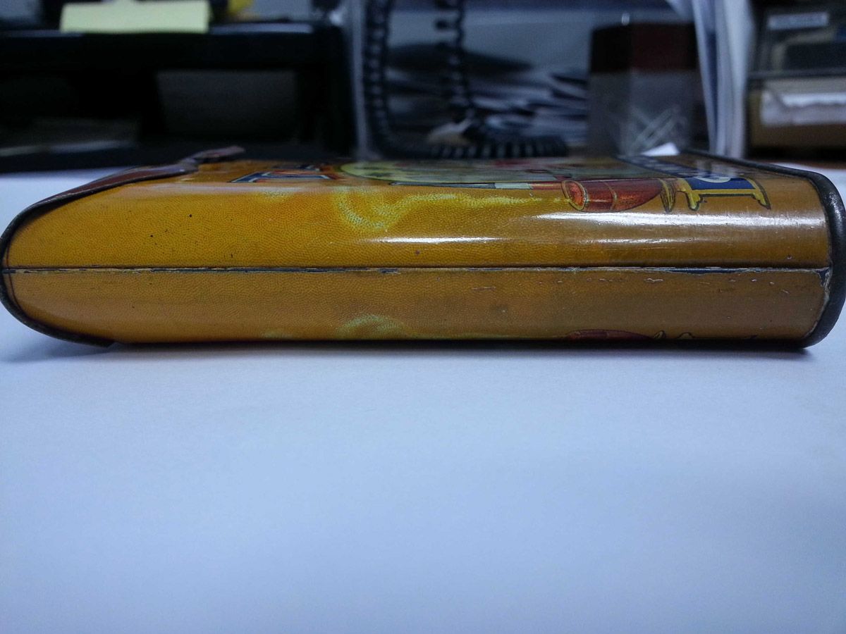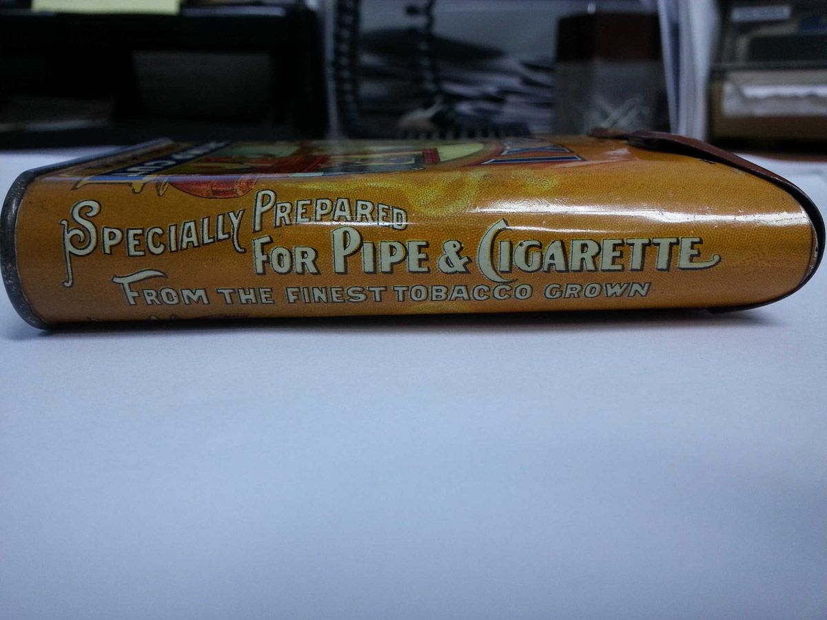 One of the Holy Grails to tobacco tin collectors. This embossed roll top tin has taxi cab graphics on both sides. SIZE: 4-1/4" t. CONDITION: Near excellent; wonderful original surface sheen; only minuscule wear to relief hinge areas and the embossed lid front. 1-13226-1