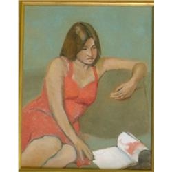 TAYLOR, Frederick Bourchier, R.C.A., 1906-1987. "Lady in a Red Dress". Huile sur toile, signée. Oil on canvas, signed. 20" x 16" - 50.8cm x 40.6cm. $400/600