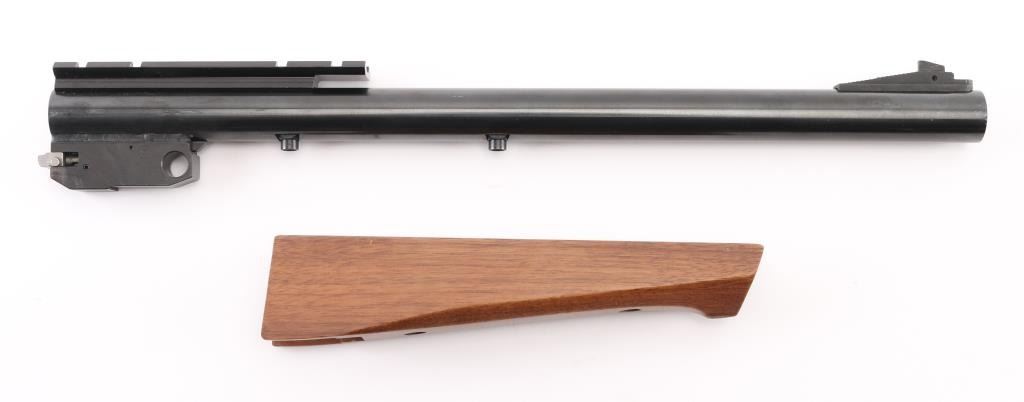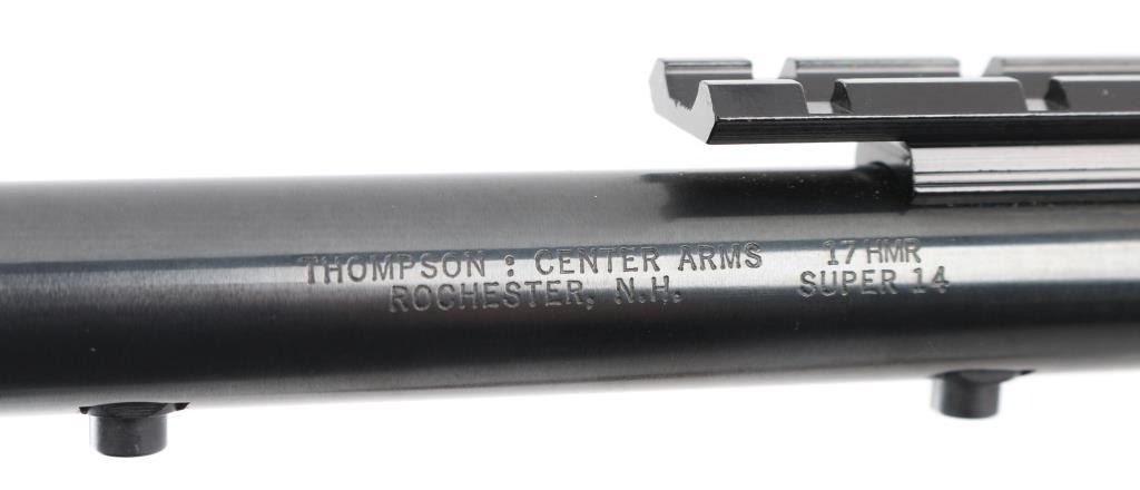 14" blue, round barrel " Super 14" chambered in .17 HMR. Serrated ramp red front sight with Weaver style scope rail, comes with smooth walnut forearm, needs screws. Excellent condition including the bore.