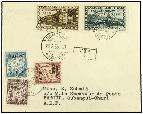 1935 Incoming mail from Saar bearing 25 c deep blue (SG 179) and 40 c brown (SG 181) tied by HOMBURG datestamp, underpaid with boxed TAX handstamp and bearing Oubangui-Chari postage dues 5 c blue (Yvert 1), 50 c lilac (Yvert 7) and 1 f lilac brown (Yvert 9) applied and tied on arrival by OUBANGUI datestamp. Very scarce item of postage due mail.