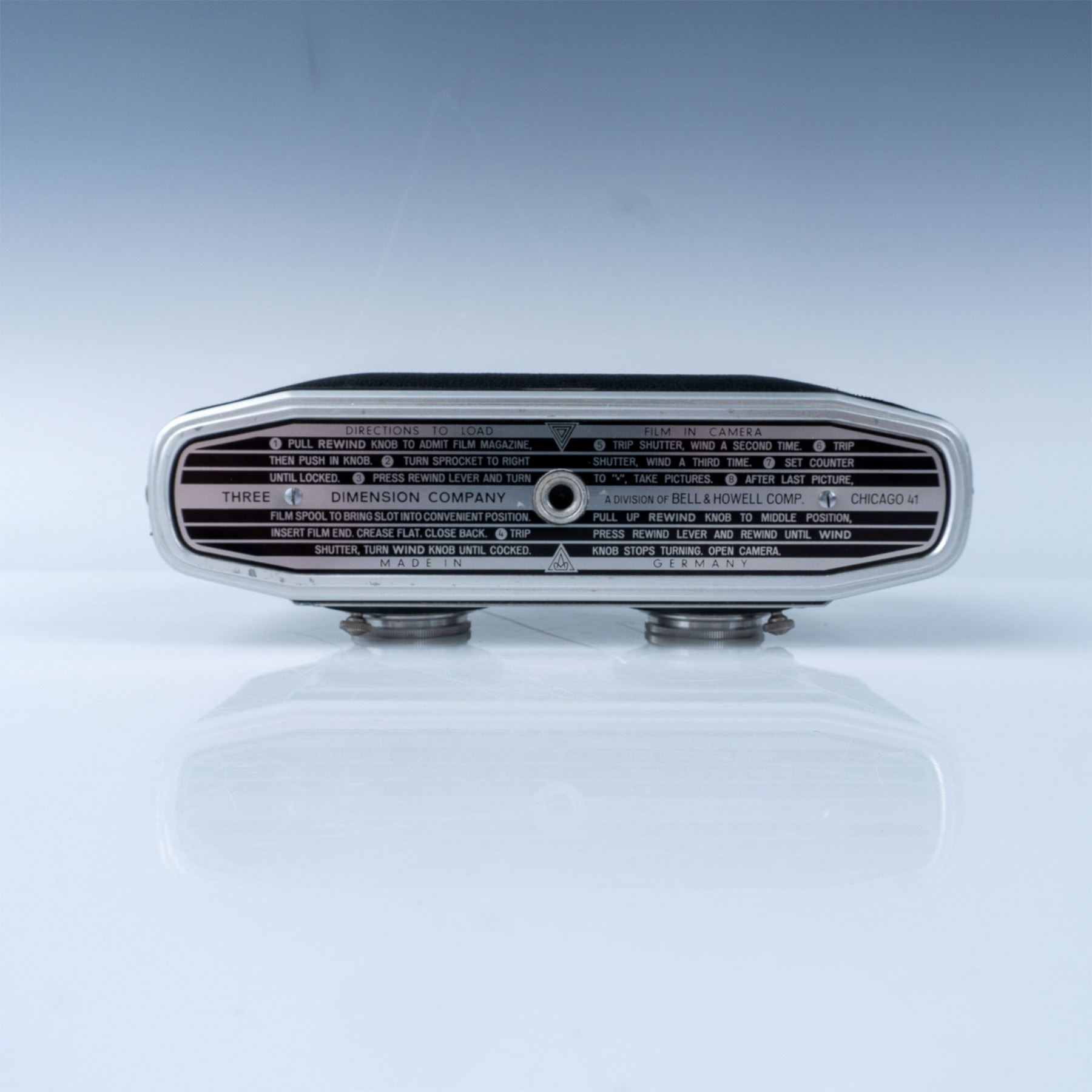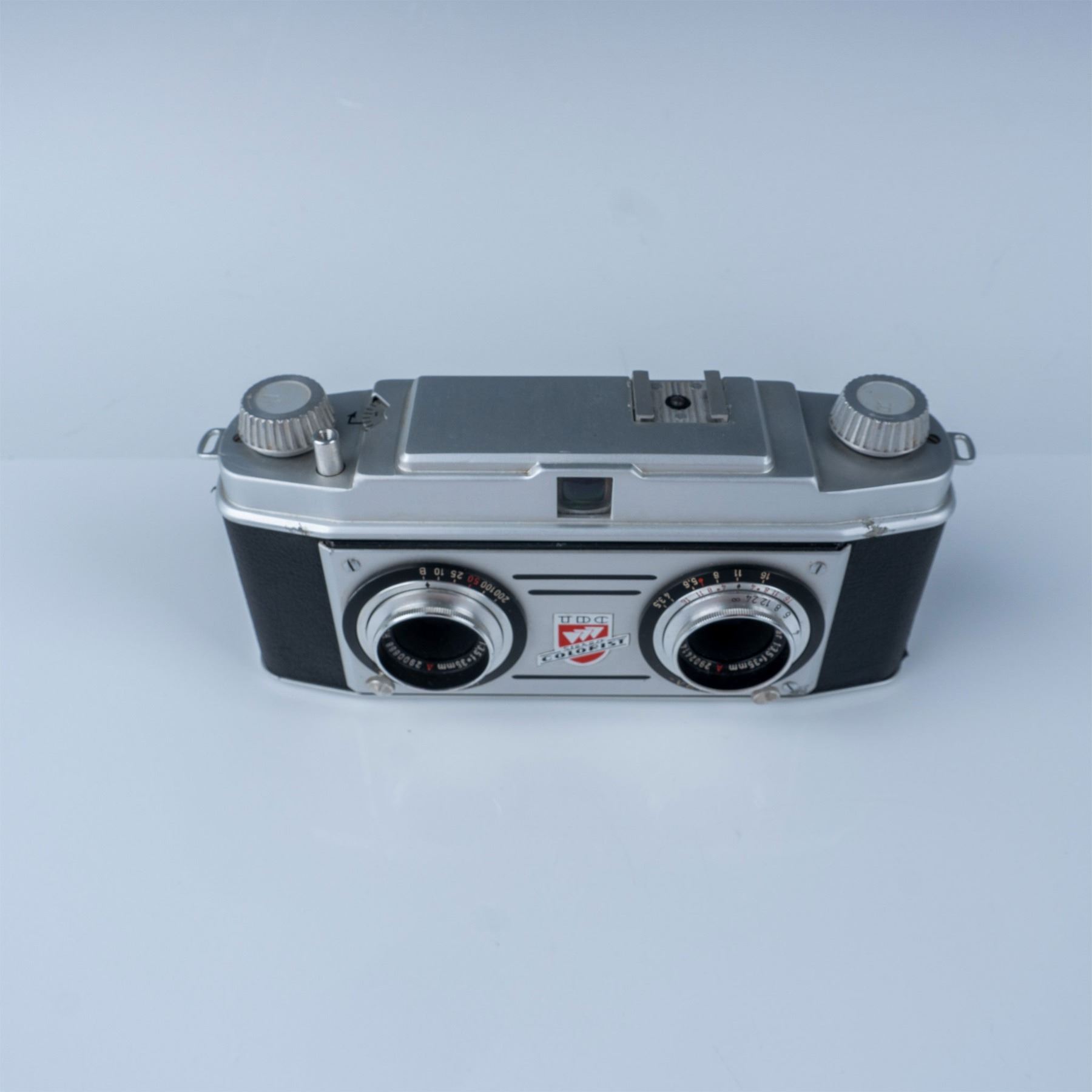 This vintage TDC Colorist stereo camera features dual Rodenstock lenses, marked as 35mm f/3.5 Velio and Stereo Trinar. Manufactured by the Three Dimension Company, this camera was designed for stereo photography, allowing users to capture images in three-dimensional detail. The front plate bears the TDC logo, emphasizing its place in the mid-20th-century photographic equipment market. The camera retains its original design, including detailed instructions etched into the base. A collectible piece for photography enthusiasts or vintage camera collectors.