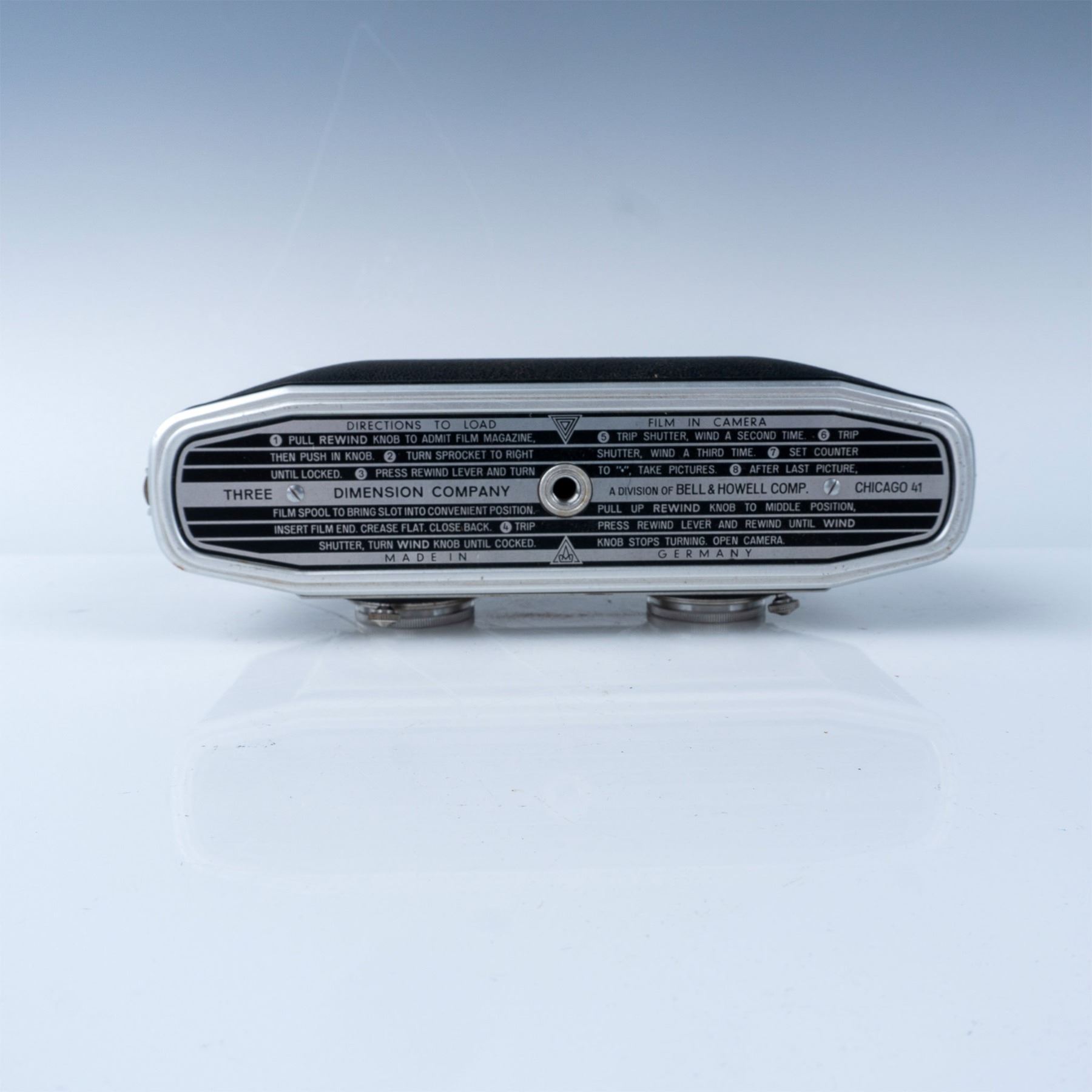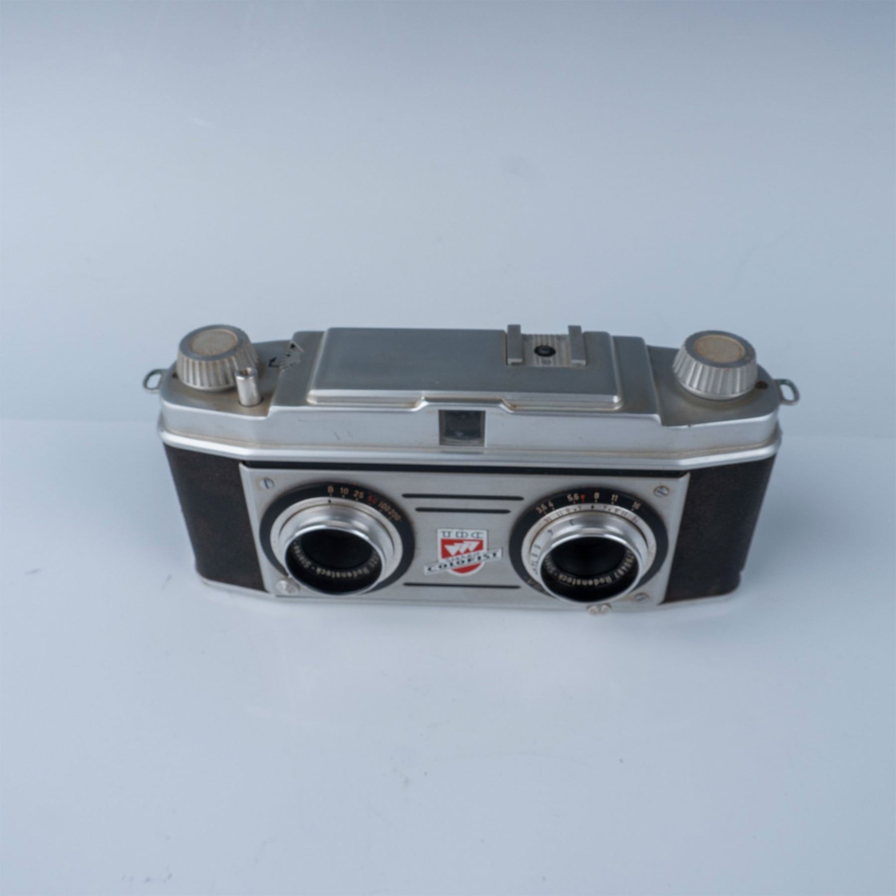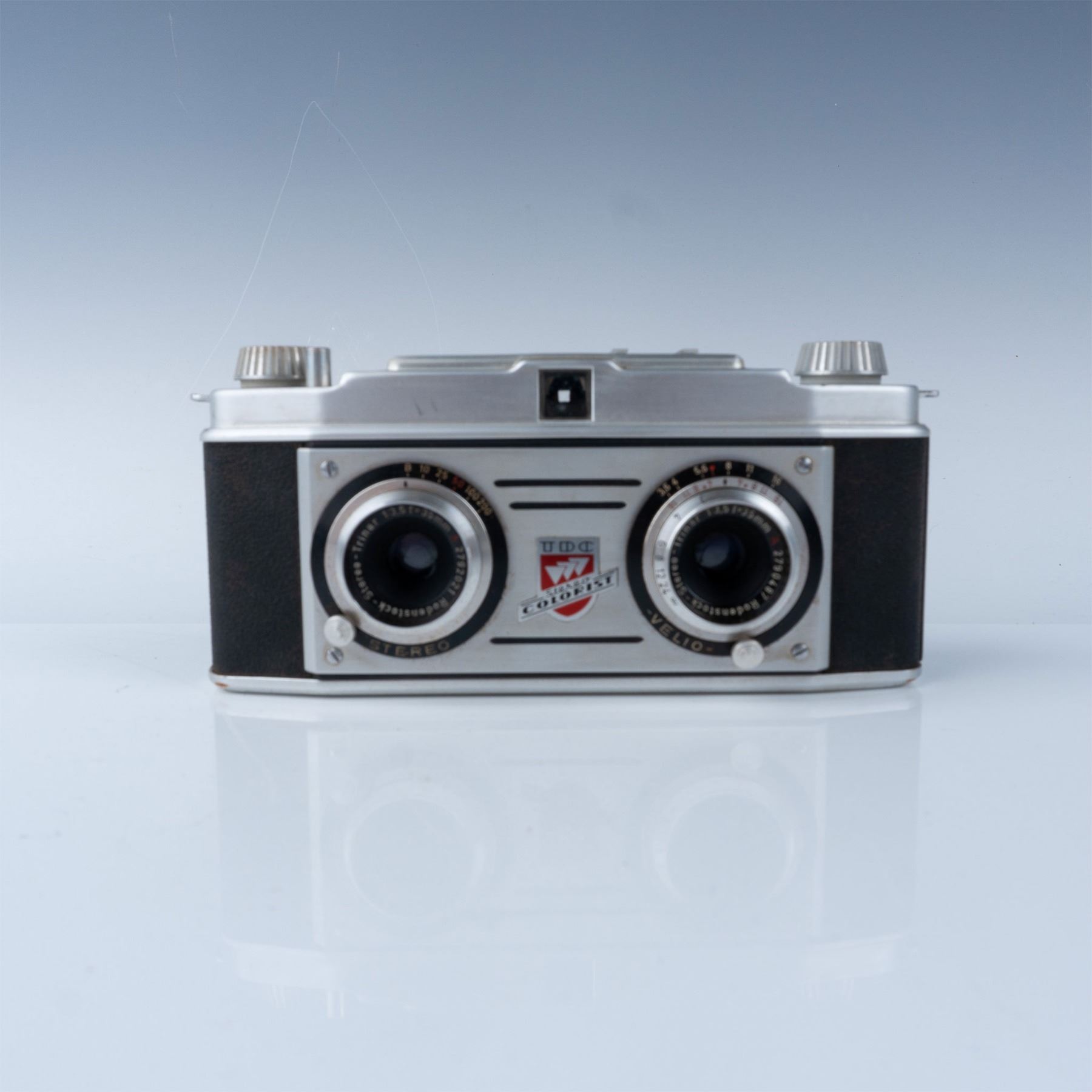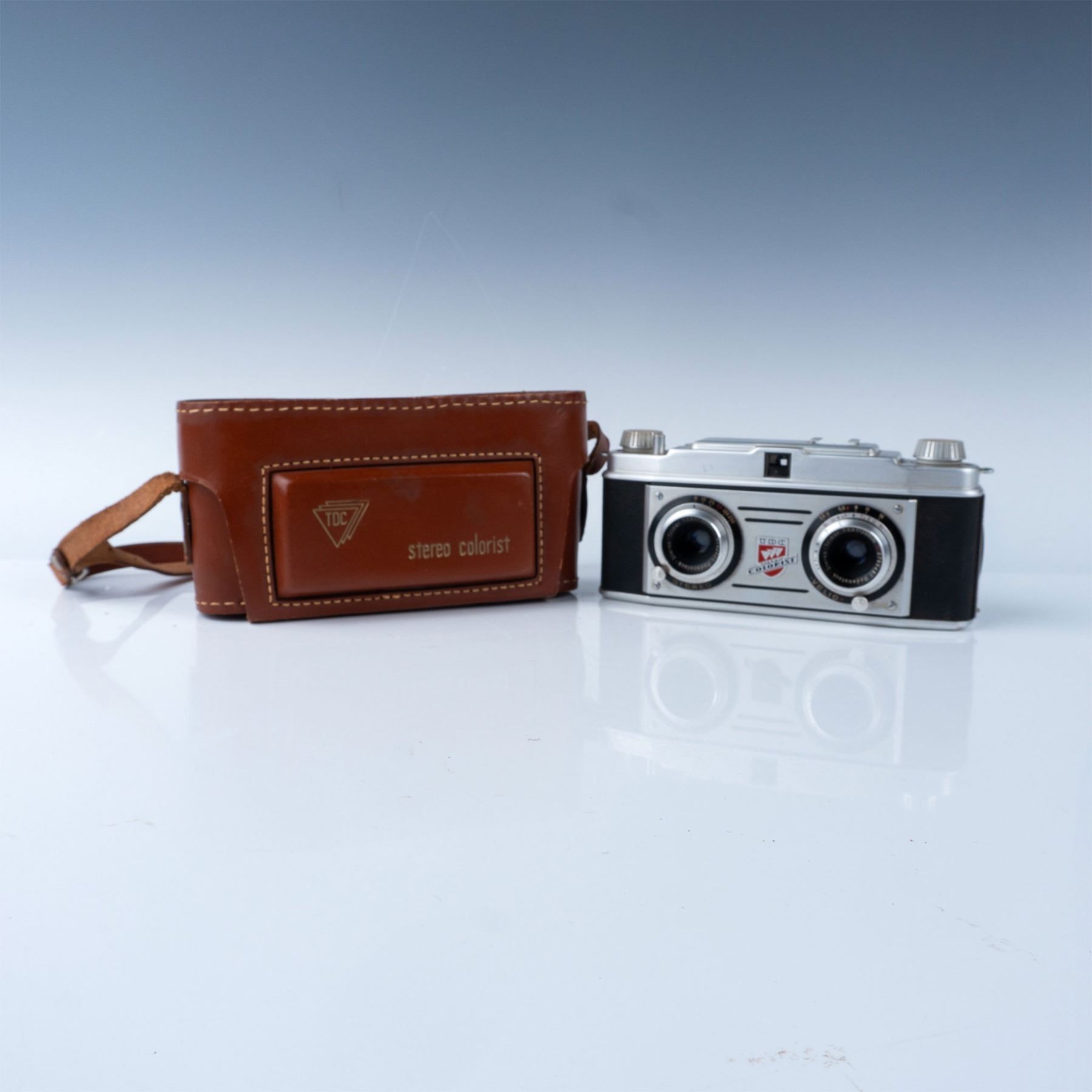 A TDC Stereo Colorist camera, a classic stereoscopic camera for creating 3D photographic images. Featuring twin Velio lenses with f3.5 apertures, this vintage model exemplifies mid-century photographic technology. Accompanied by its original TDC-branded leather carrying case with a secure snap closure and adjustable strap, the set remains a remarkable collector’s piece. The case's exterior is embossed with the TDC Stereo Colorist branding.