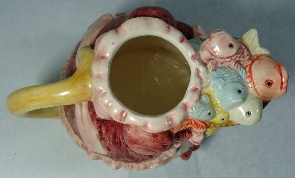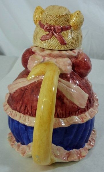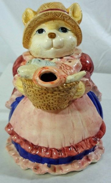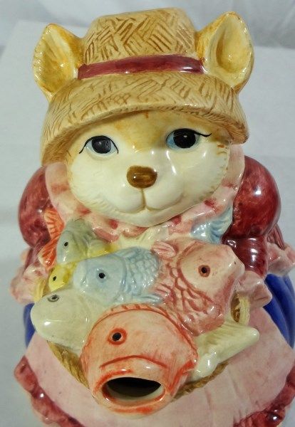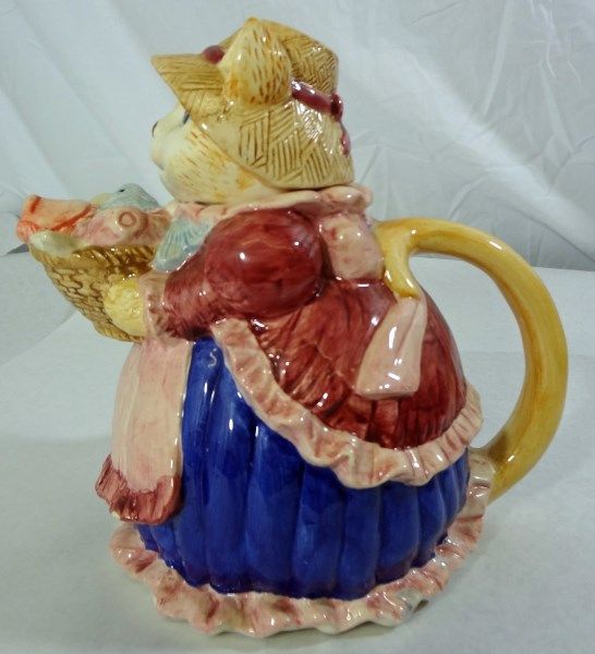 TEA POT AND LID, CERAMIC, CAT PUSS KITTY IN DRESS WITH BASKET OF FISH. Est Value $25-40.00. Silvertowne is rated as a top company on Proxiblog because of its expert grading.
