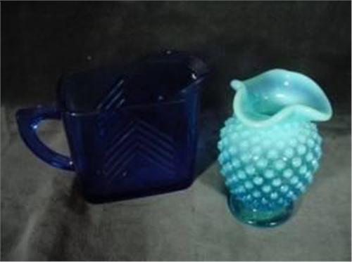 TEAL COLORED HOBNAIL SMALL VASE WITH RUFFLED RIM. 4" AND COBALT BLUE RECTANGULAR CREAM PITCHER. 3.25"X5"..