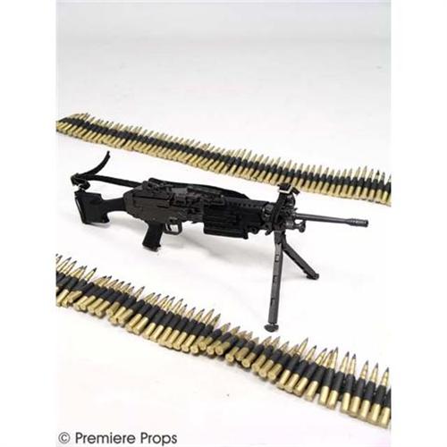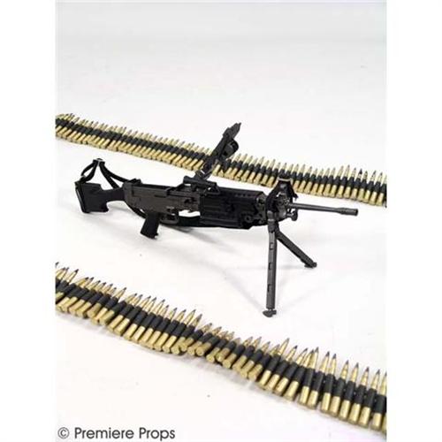 Take home this awesome miniature machine gun and bullets today!! The detailed mini plastic gun comes with 2 belts of metal bullets. The gun opens where the ammo would be loaded, has a functional bi-pod, and a strap. The gun can be cocked back (spring inside) and the bullets can be removed from belt but do not loaded into gun!! The gun is approx. 6.75" x 1.5" and the ammo belts are approx. 11" long x 1"! The true collector would love this miniature realistic looking machine gun!! Take home one of the great movie props from the set of TEAM AMERICA today!!!!!!!! (TA2372)