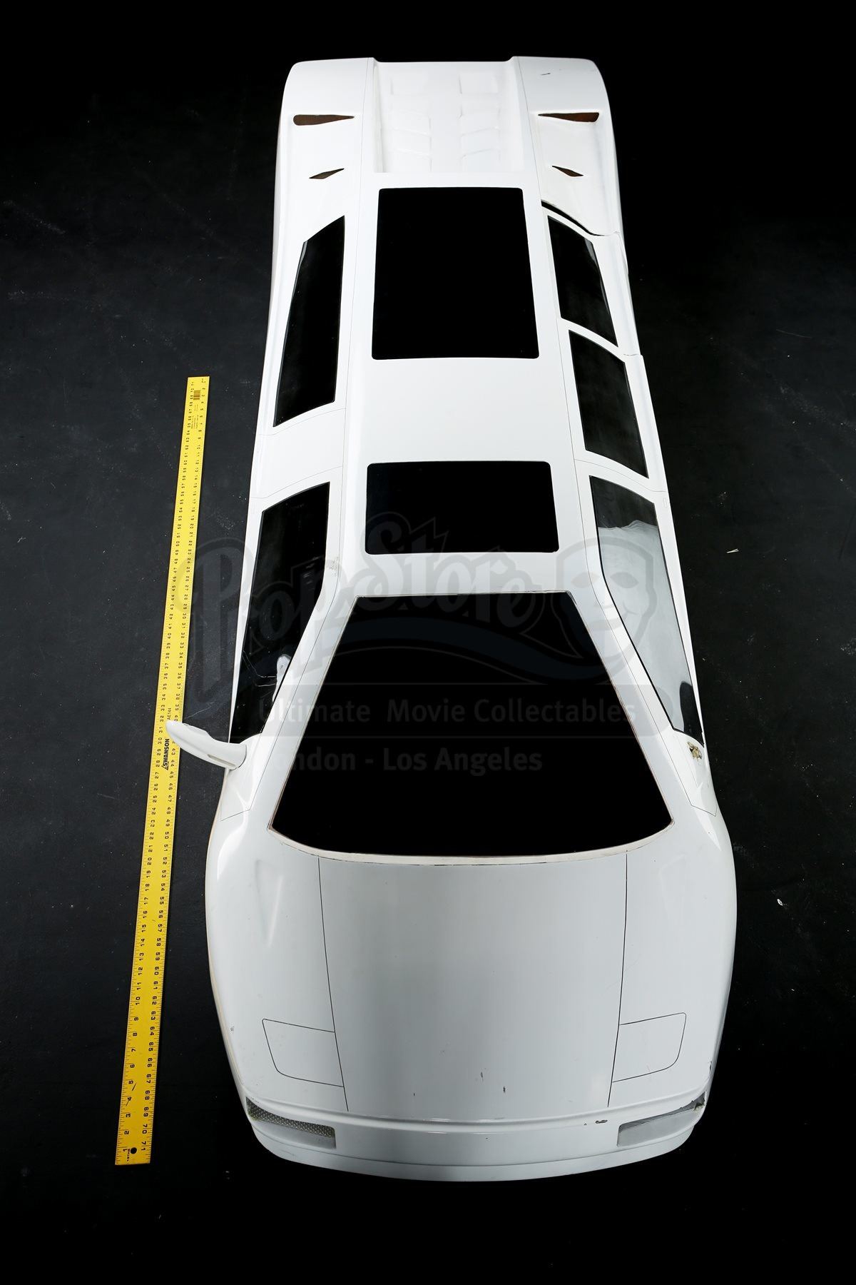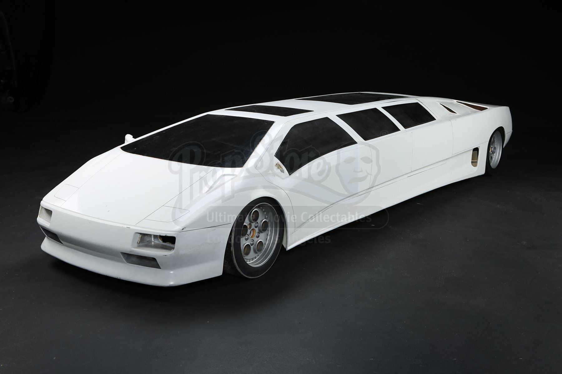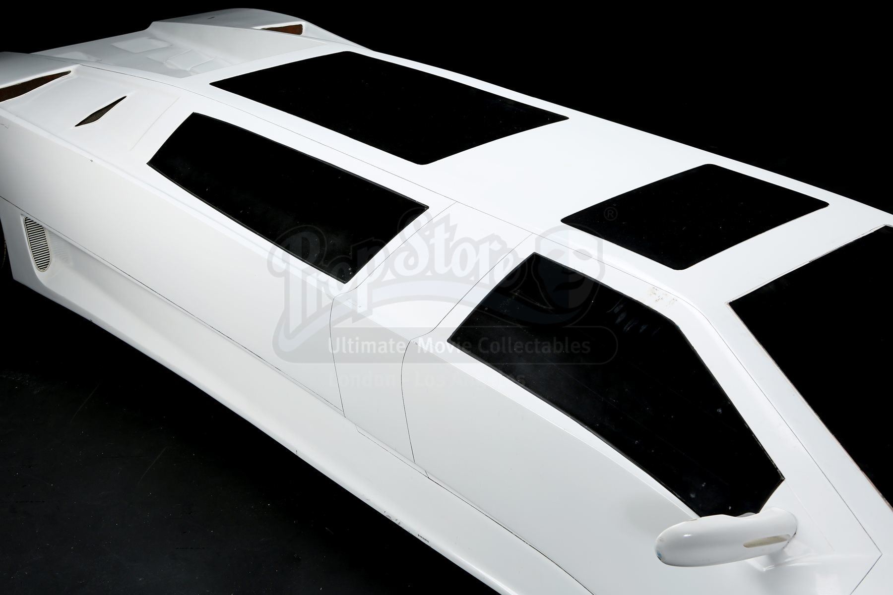 The bespoke limousine consists of a fibreglass shell with resin, plastic, wood and metal components. The vehicle features numerous dark-tinted faux windows, with three on the left, two each on the right, front and back, and two sunroofs. On the left side of the limousine is a functioning door, which opens to reveal luxurious seating within. The miniature shows wear due to production use, with one of the side mirrors missing, along with the front left headlight. The lot remains in good overall condition. Dimensions: 312 cm x 84 cm x 48 cm (112” x 33” x 19”)