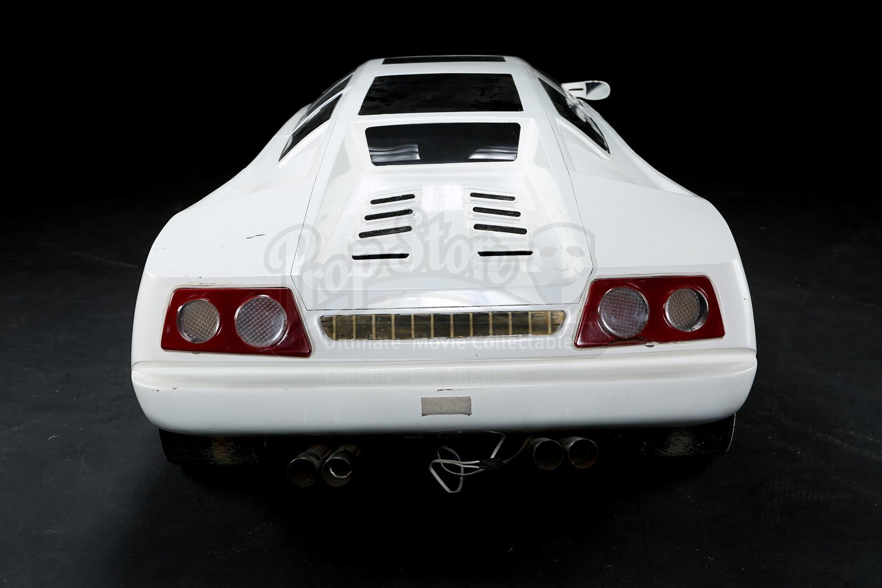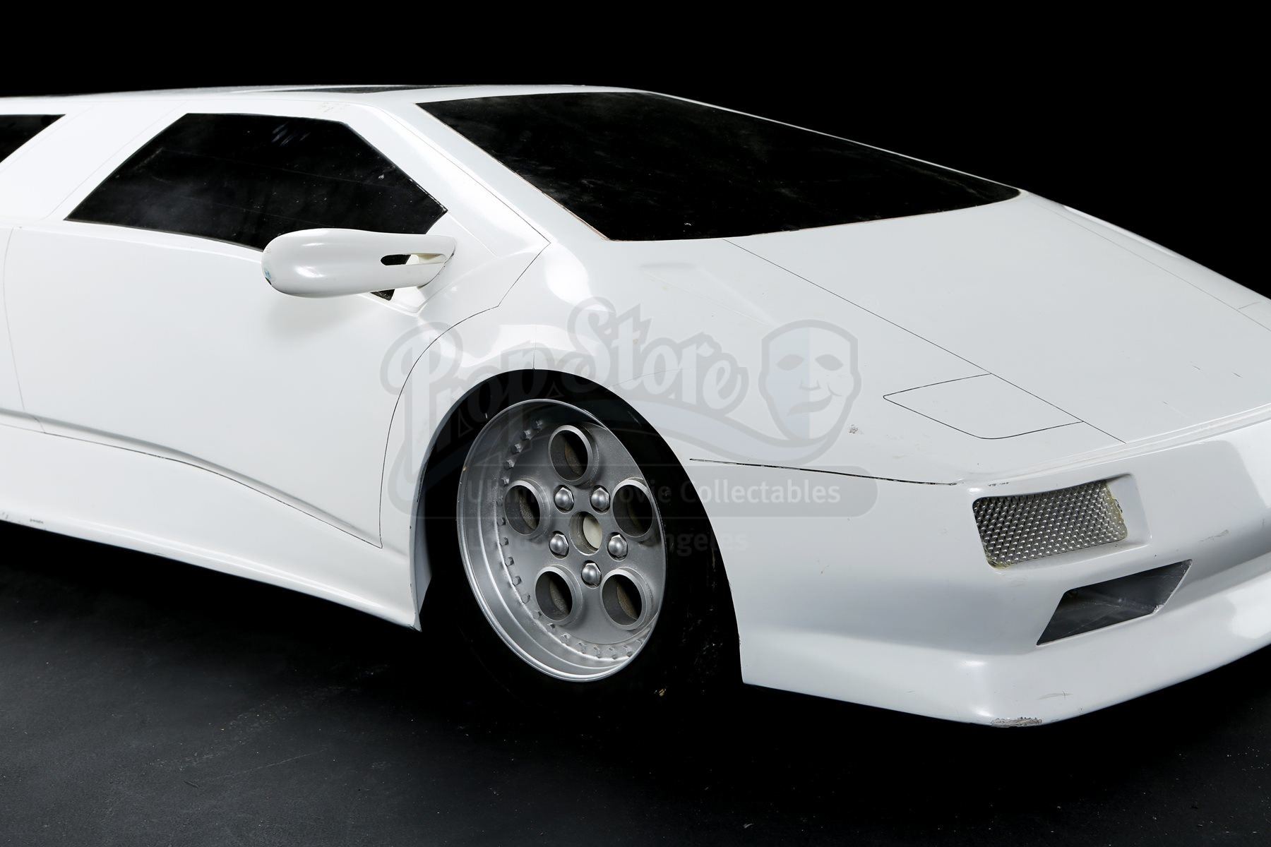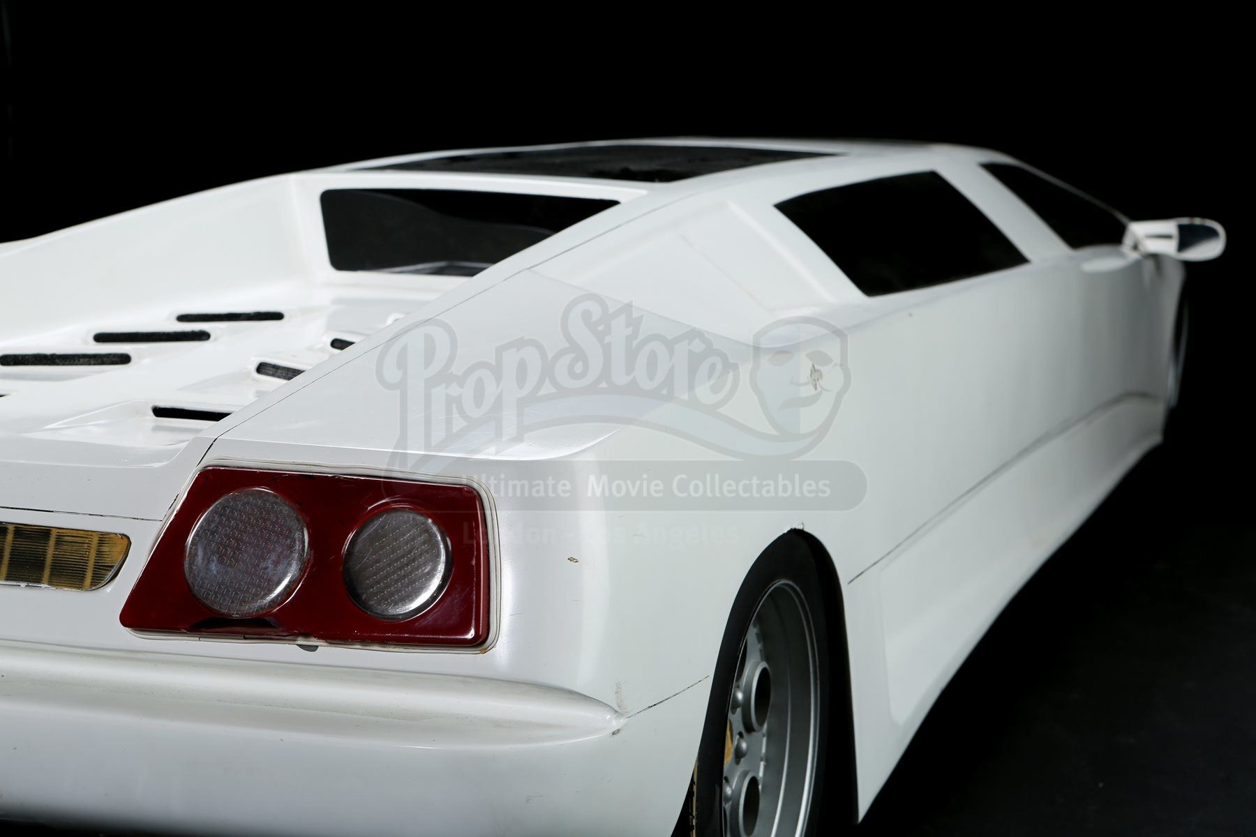The bespoke limousine consists of a fibreglass shell with resin, plastic, wood and metal components. The vehicle features numerous dark-tinted faux windows, with three on the left, two each on the right, front and back, and two sunroofs. On the left side of the limousine is a functioning door, which opens to reveal luxurious seating within. The miniature shows wear due to production use, with one of the side mirrors missing, along with the front left headlight. The lot remains in good overall condition. Dimensions: 312 cm x 84 cm x 48 cm (112” x 33” x 19”)