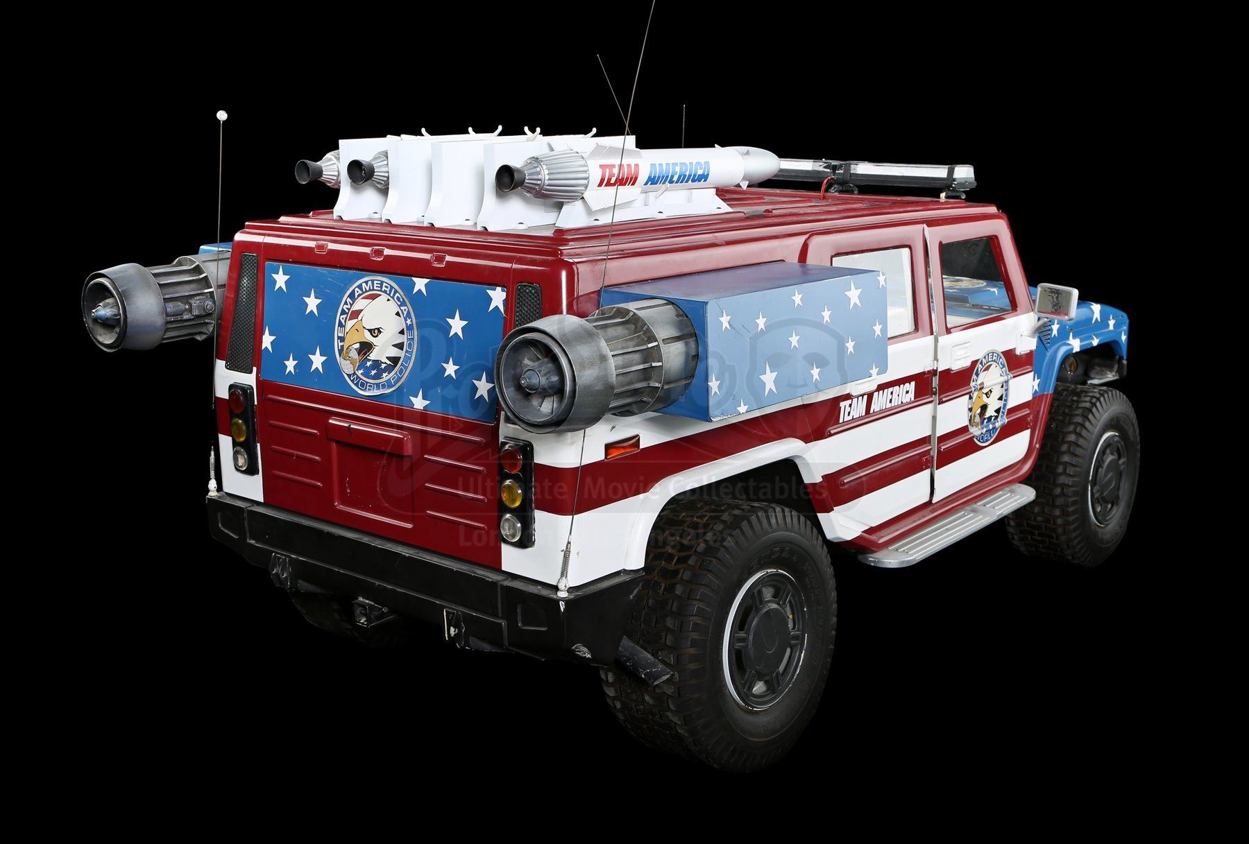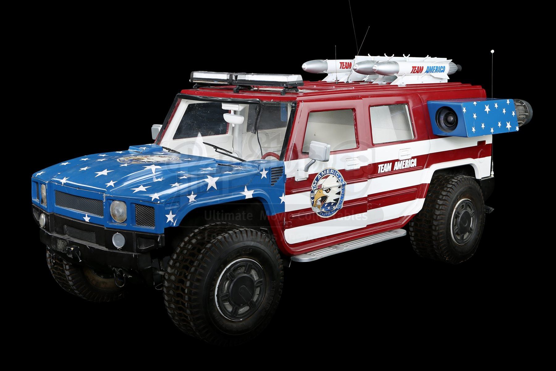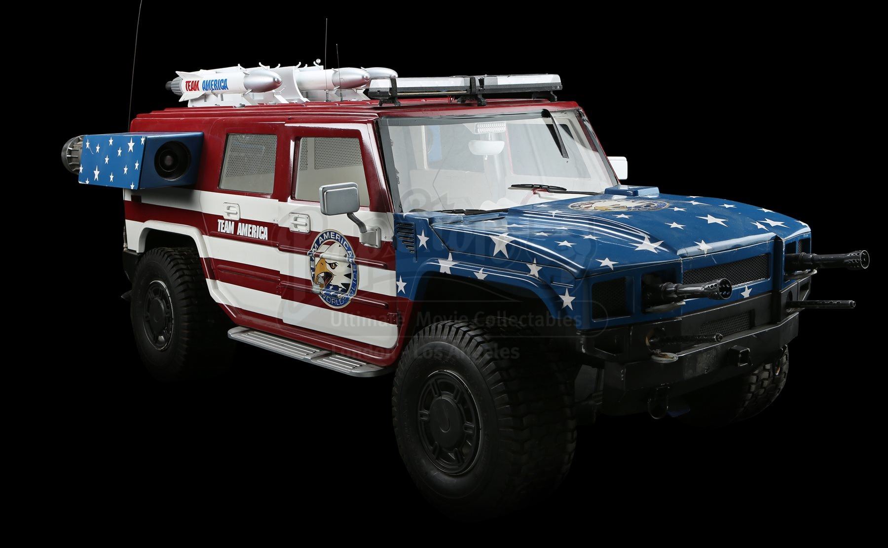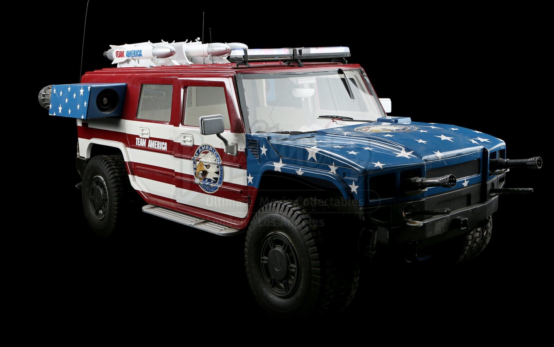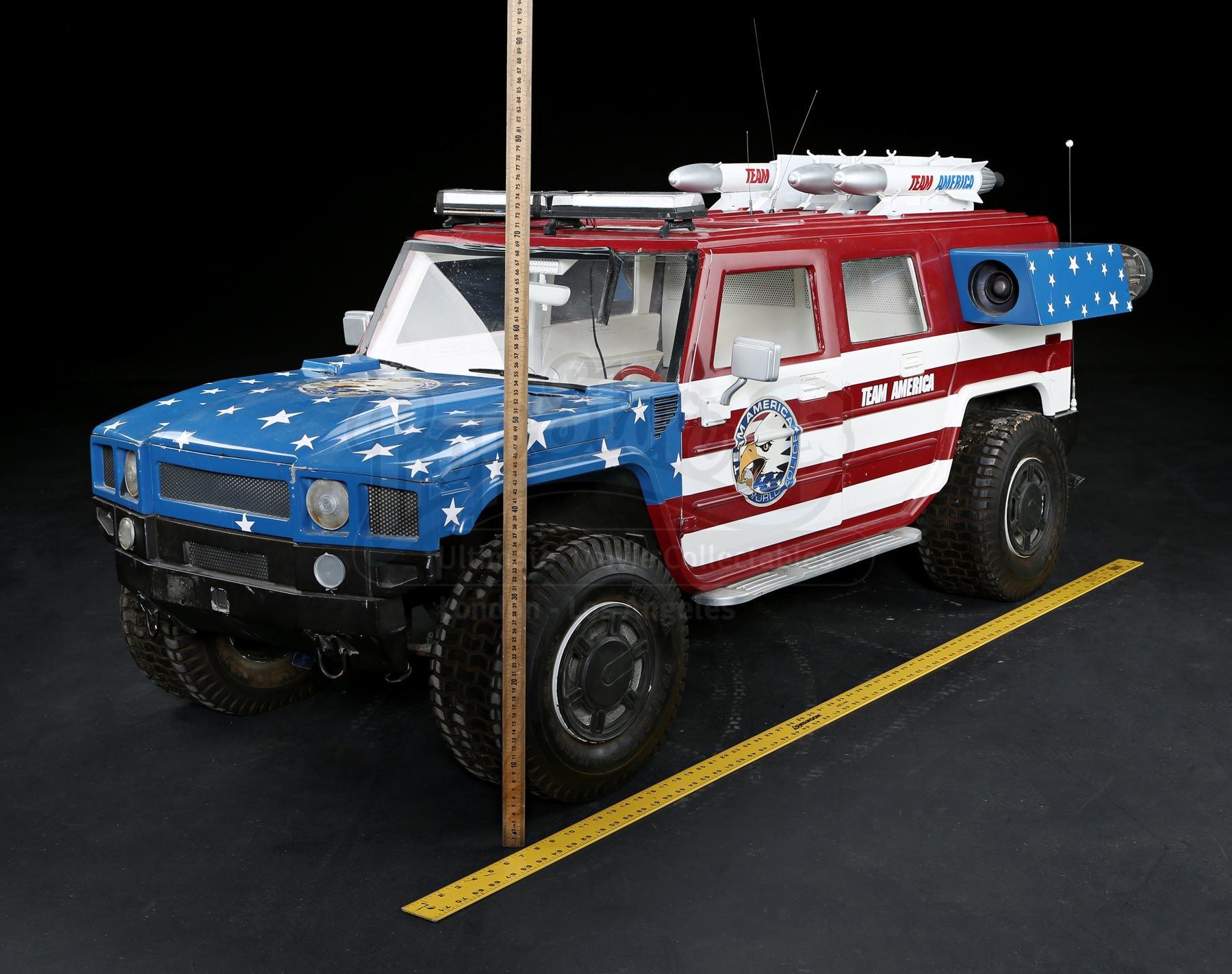 A Team America Hummer H2 model miniature from Trey Parker’s action comedy Team America: World Police. Performed by marionette puppets, the film followed Broadway actor Gary Johnston (Trey Parker) who was recruited by the elite counter-terrorism organisation Team America. The group deployed a Hummer while they chased enemy operatives through the streets of Egypt.